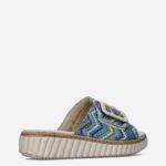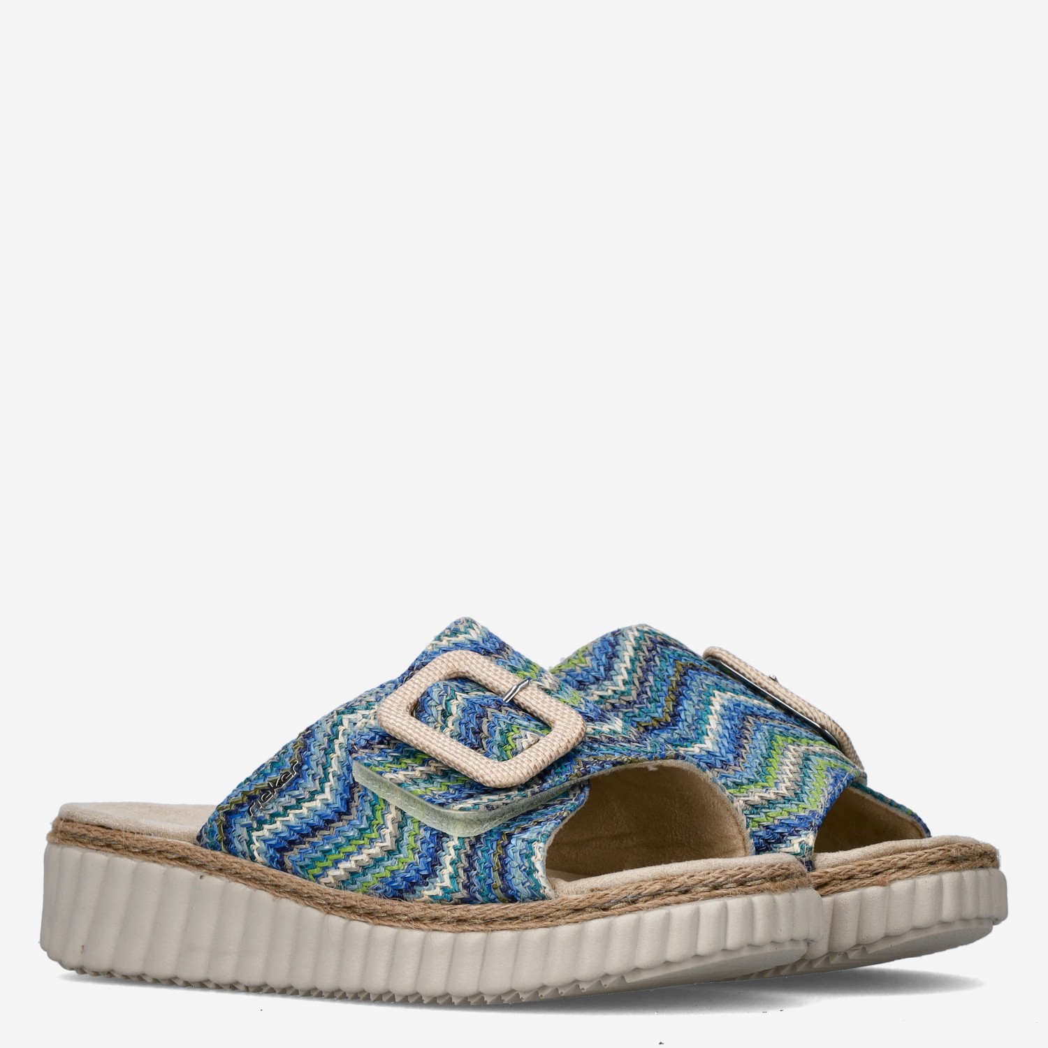 Deze blauw met groene Bast3 damesslipper van Rieker is gemaakt van textiel in combinatie met leer en synthetische materialen. De slipper is voorzien van een klittenbandsluiting voor een gemakkelijke instap. Combineer deze slipper met een mooie jurk!