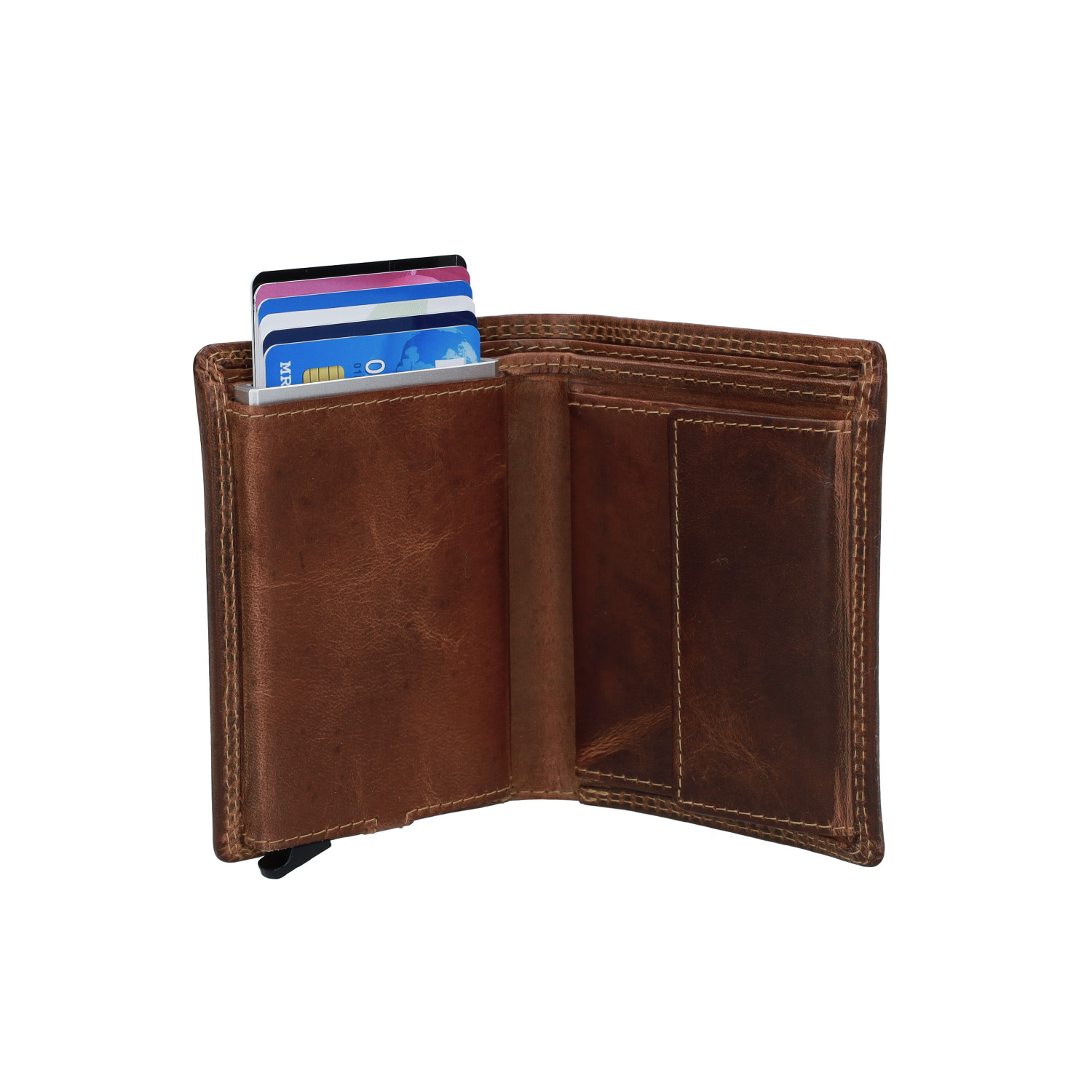 Deze bruine Leather Design Bilfold Hunter portemonnee komt uit de nieuwe collectie van Leather Design. De portemonnee is gemaakt van leer, in combinatie met stof. De portemonnee heeft ruimte voor 12 pasjes, briefgeld en wat muntgeld.