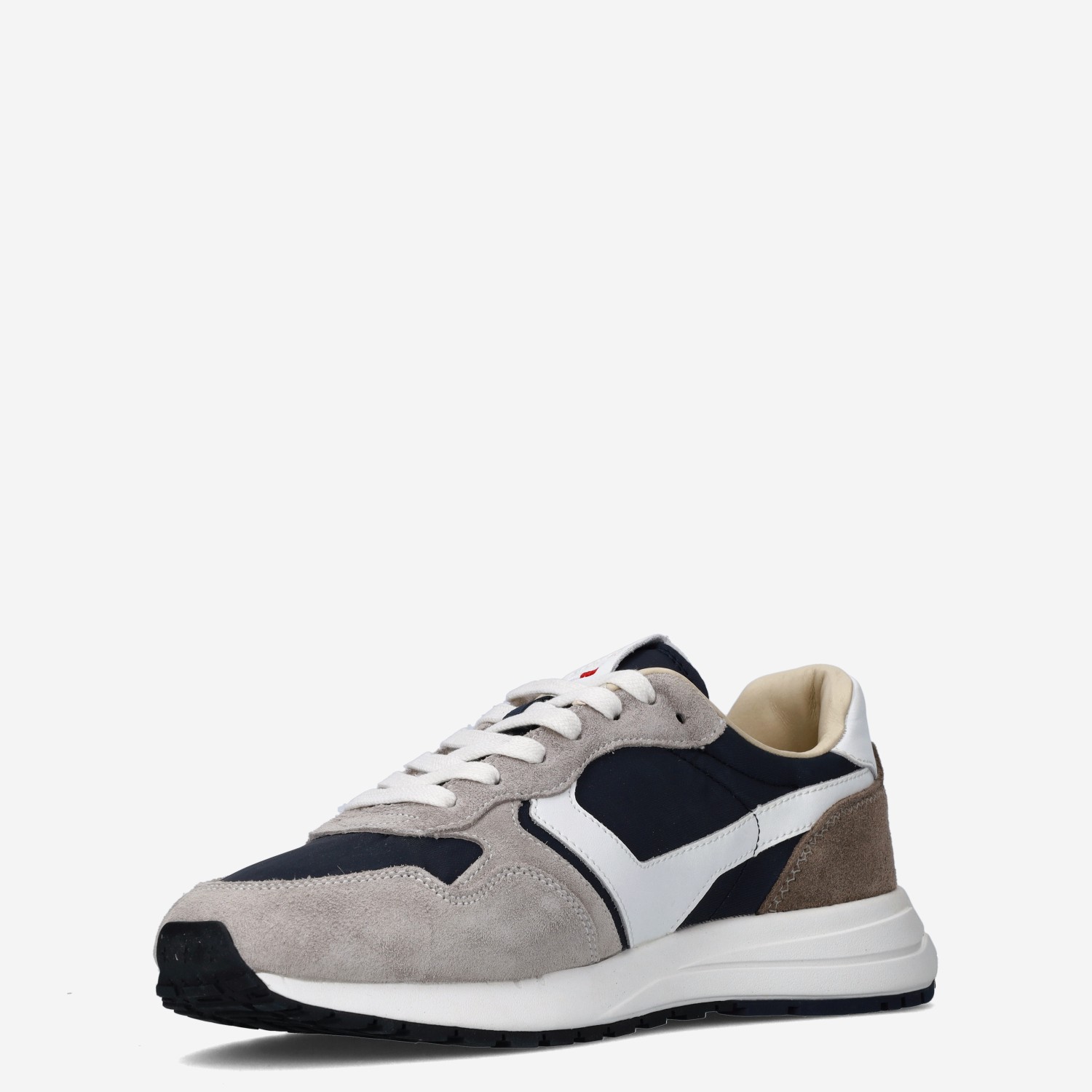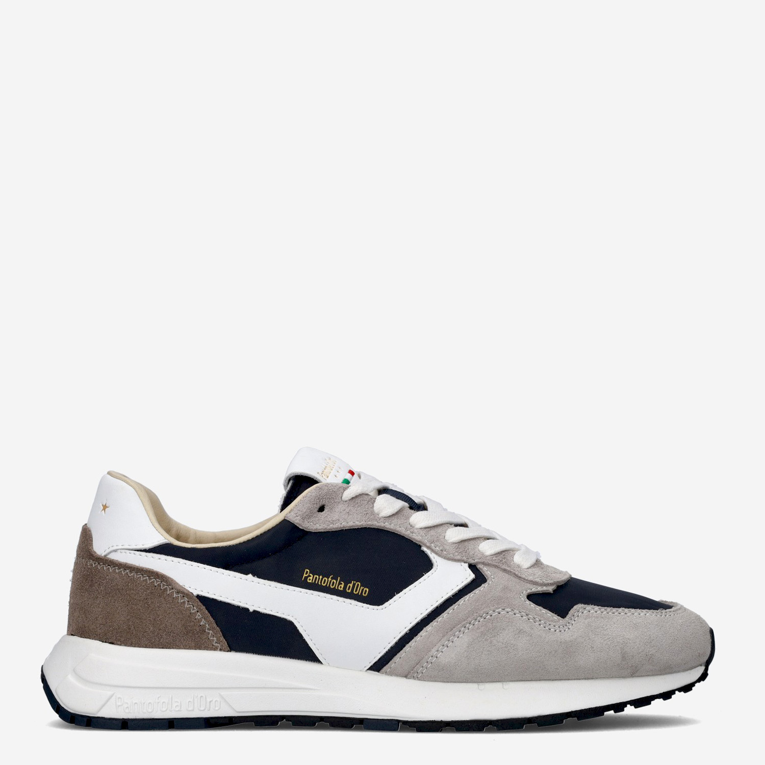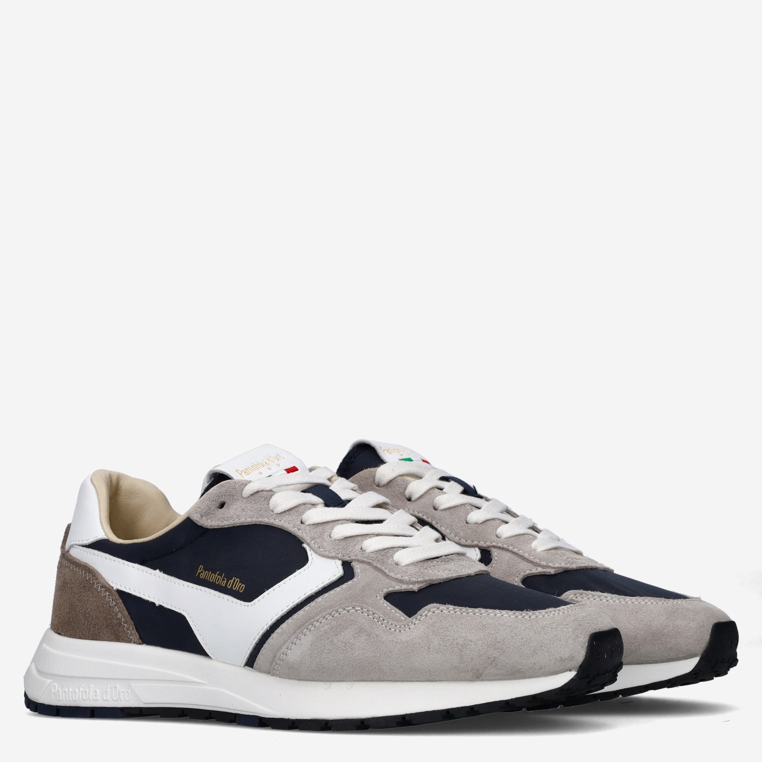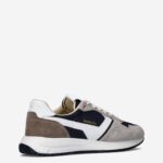 Deze grijs met wit en donker blauwe Camminare herensneaker van Pantofola d’Oro is gemaakt van suède in combinatie met andere leersoorten.