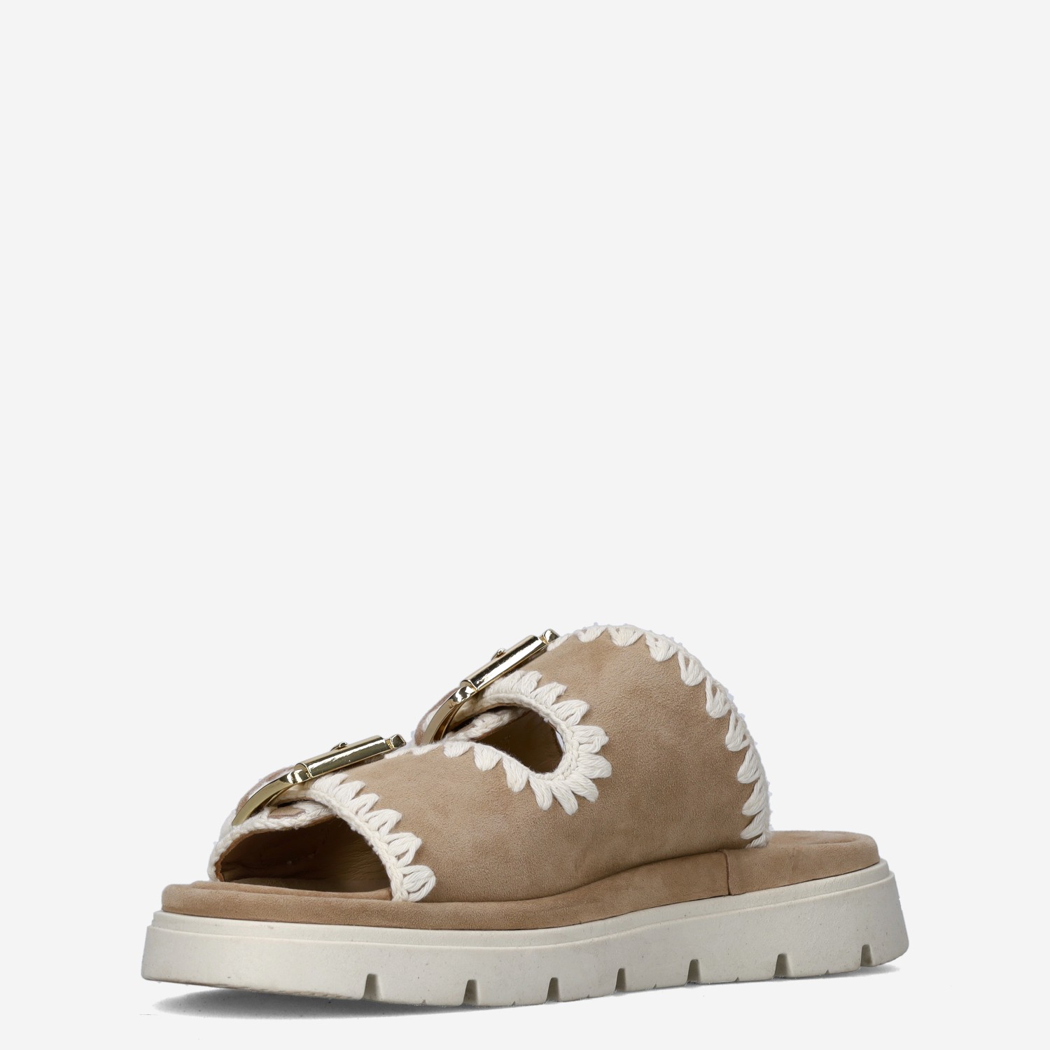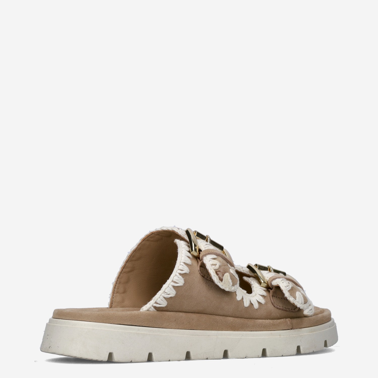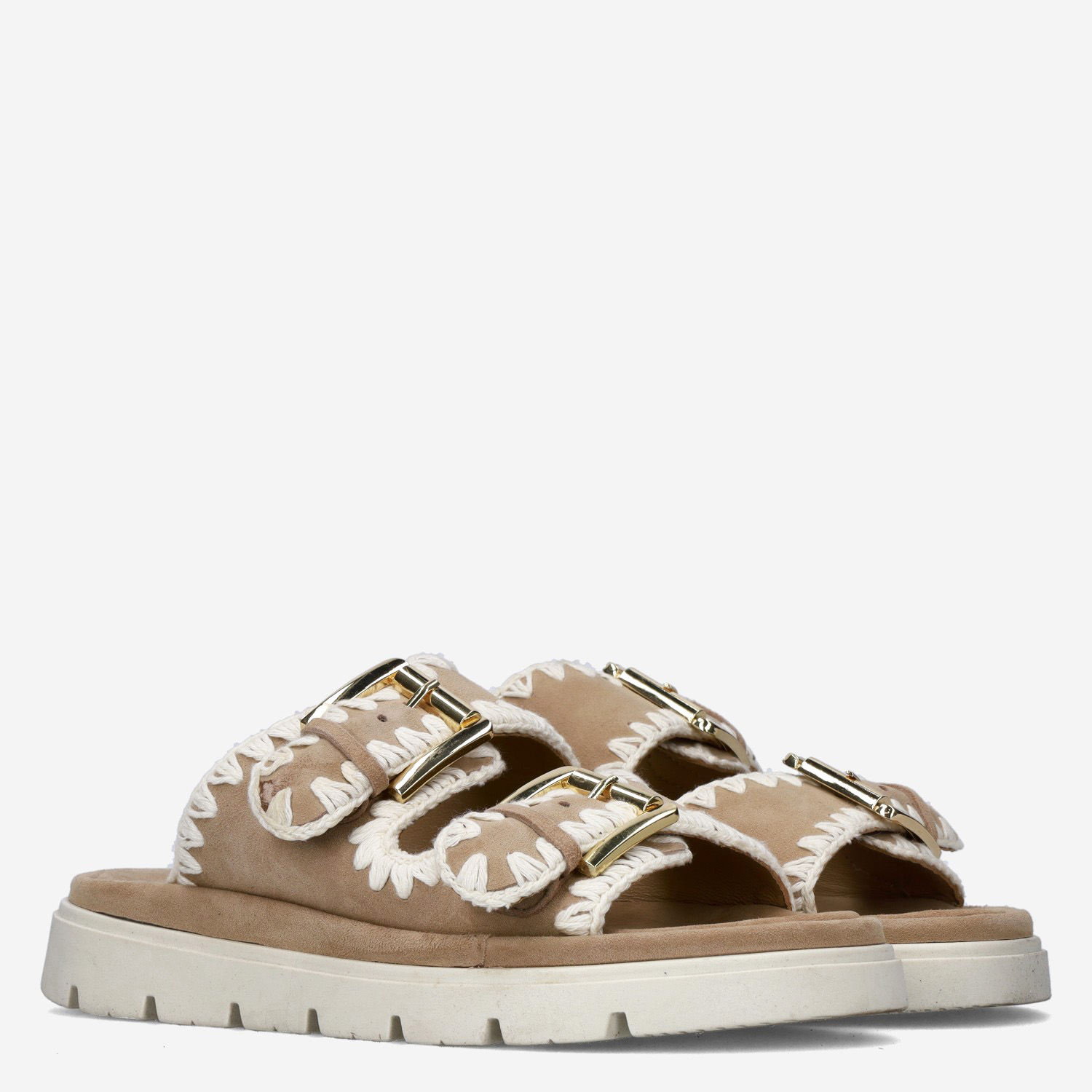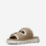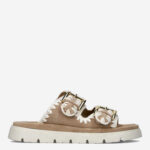 Deze beige Dilan damessandaal van Maruti is gemaakt van leer in combinatie met textiel. De slipper is voorzien van twee brede gespsluitingen voor een gemakkelijke instap. Combineer deze comfortabele slipper met een zomerse outfit!
