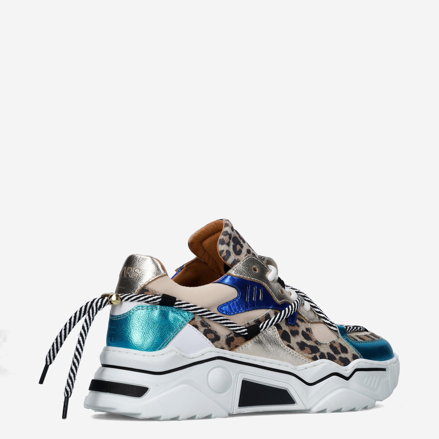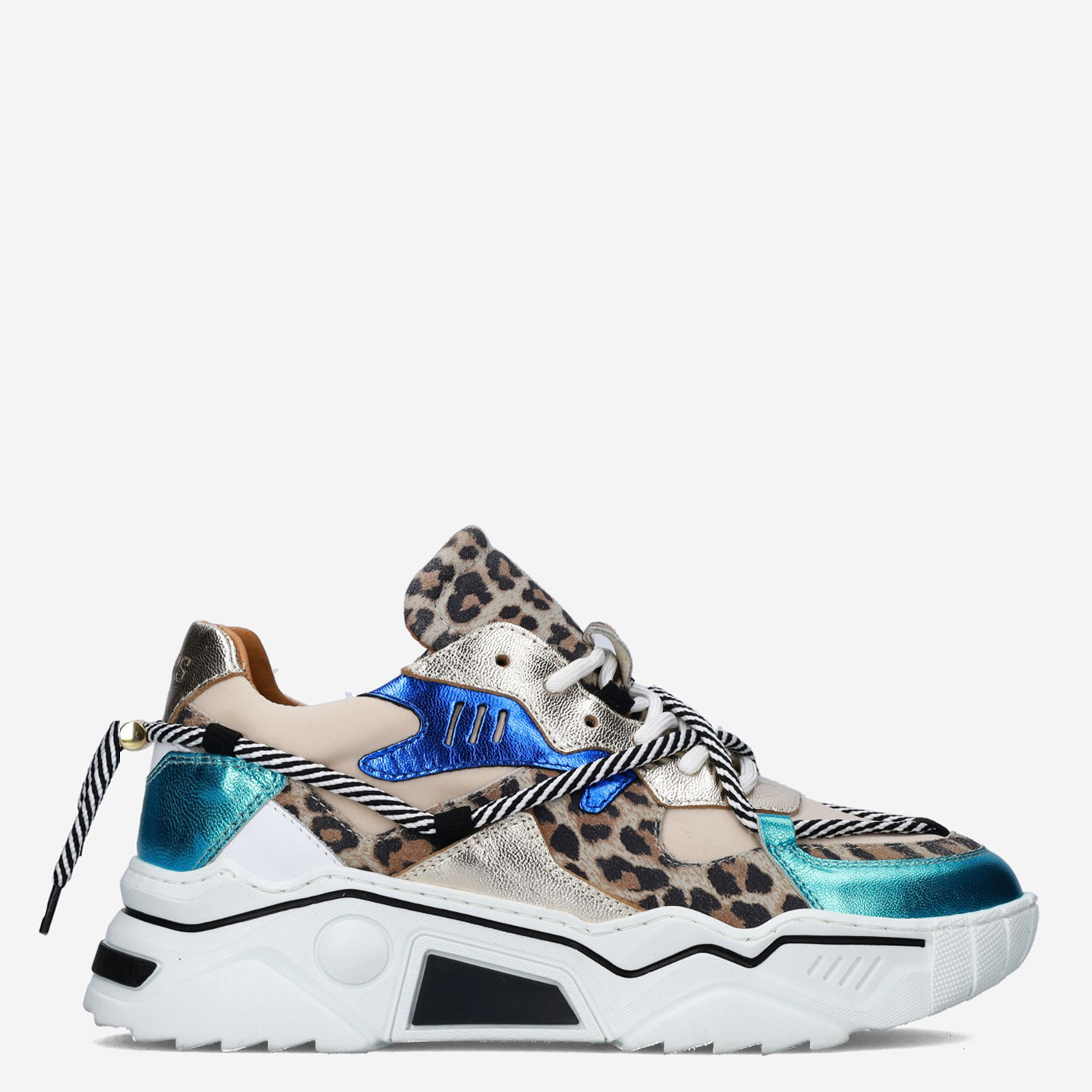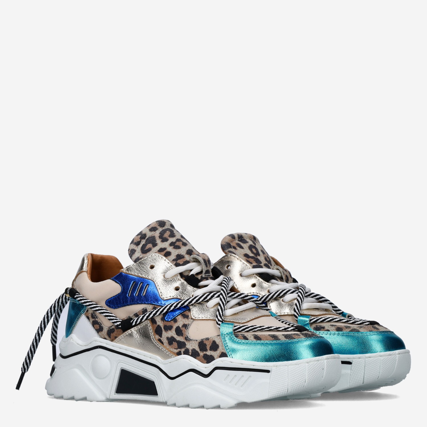 Deze metallic blauw met panterprint beklede Jupiter damessneaker van DWRS is gemaakt van leer en heeft verschillende toffe overlays van meerdere blauwe accenten. De chunky witte zool maakt dit een sportieve trendy sneaker! Combineer deze sneaker met toffe panterprint met een jeans of toffe lange rok!