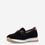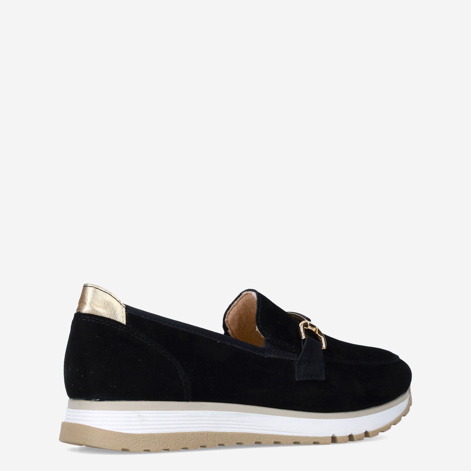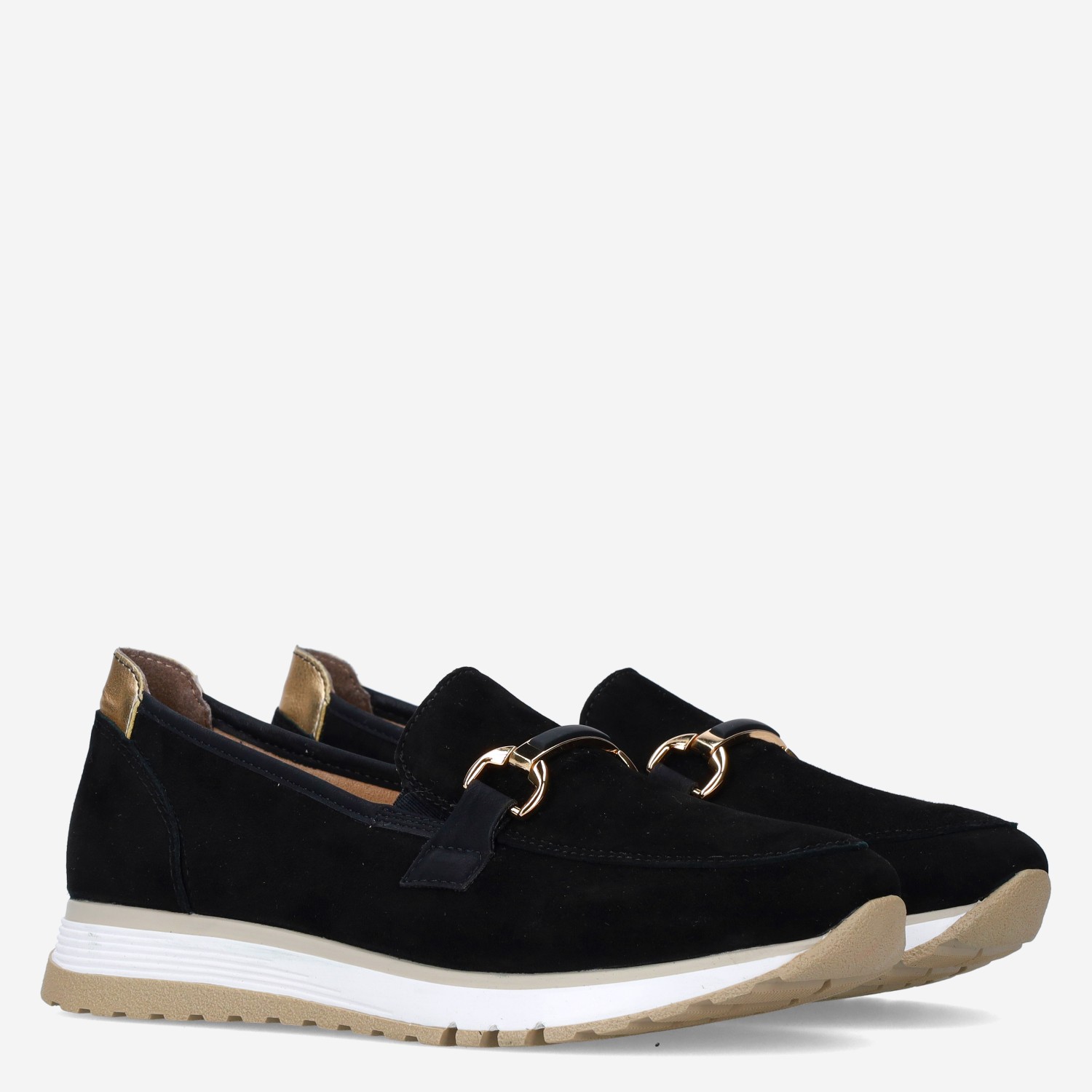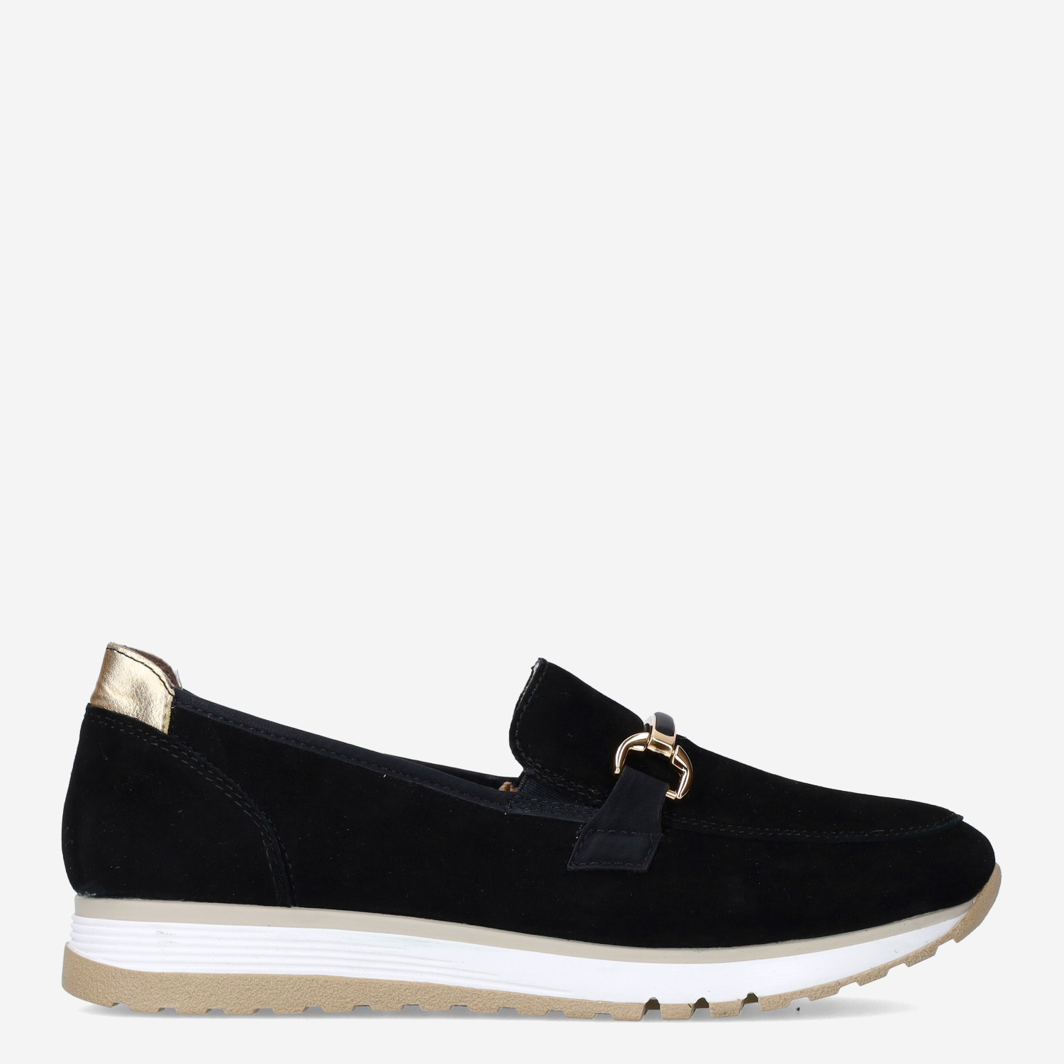 Deze zwarte Rieker Goatsuede Nabukino damesloafer is gemaakt van leer/suède. De instapper is voorzien van verschillende gouden accenten en heeft een gemakkelijke instap. Combineer deze loafer onder een jeans of rok.