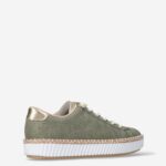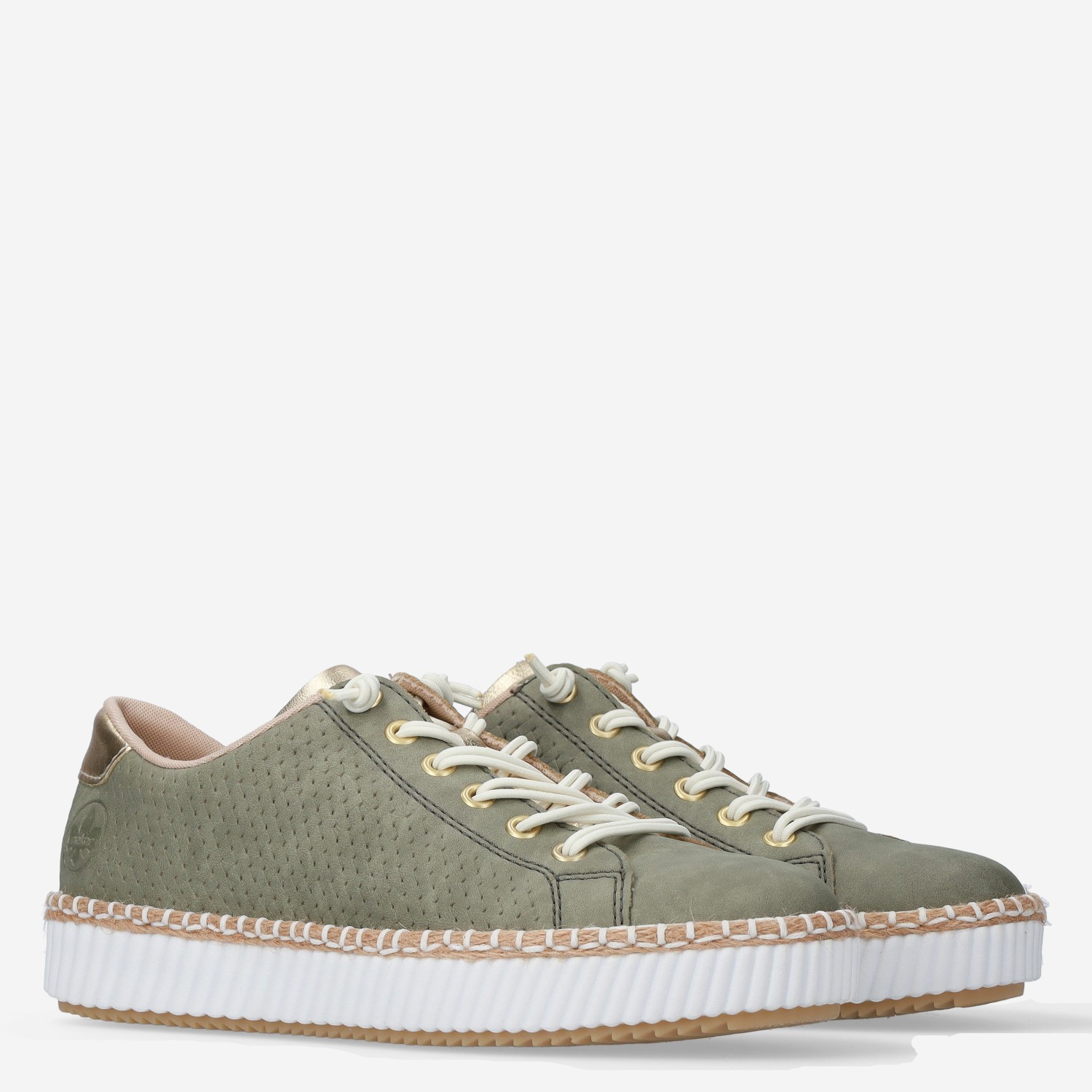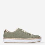 Deze groene Nabukino damessneaker van Rieker is gemaakt van suède in combinatie met geperforeerd leer. De sneaker is voorzien van verschikkende gouden accenten en heeft een casual uitstraling. Combineer deze sneaker met een jeans of lange rok.