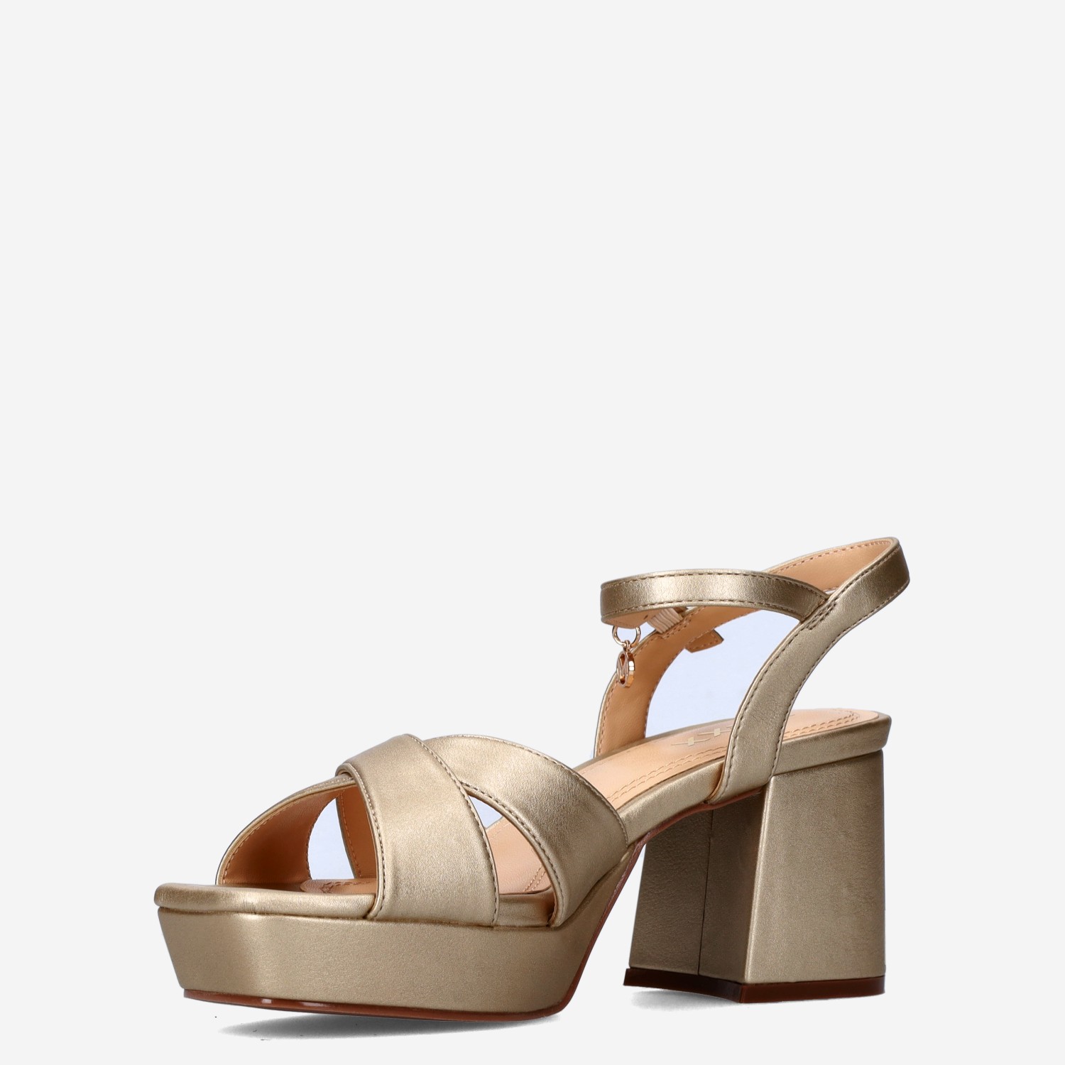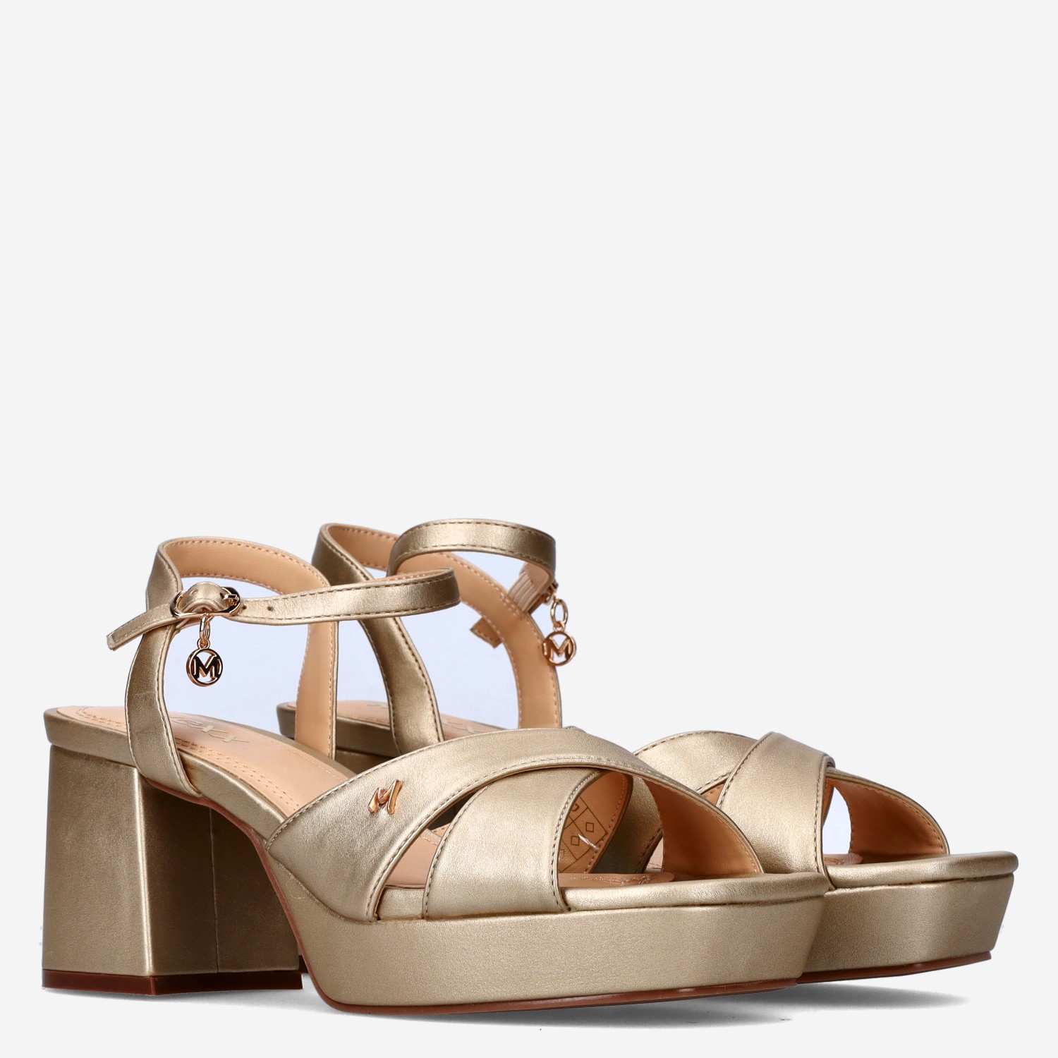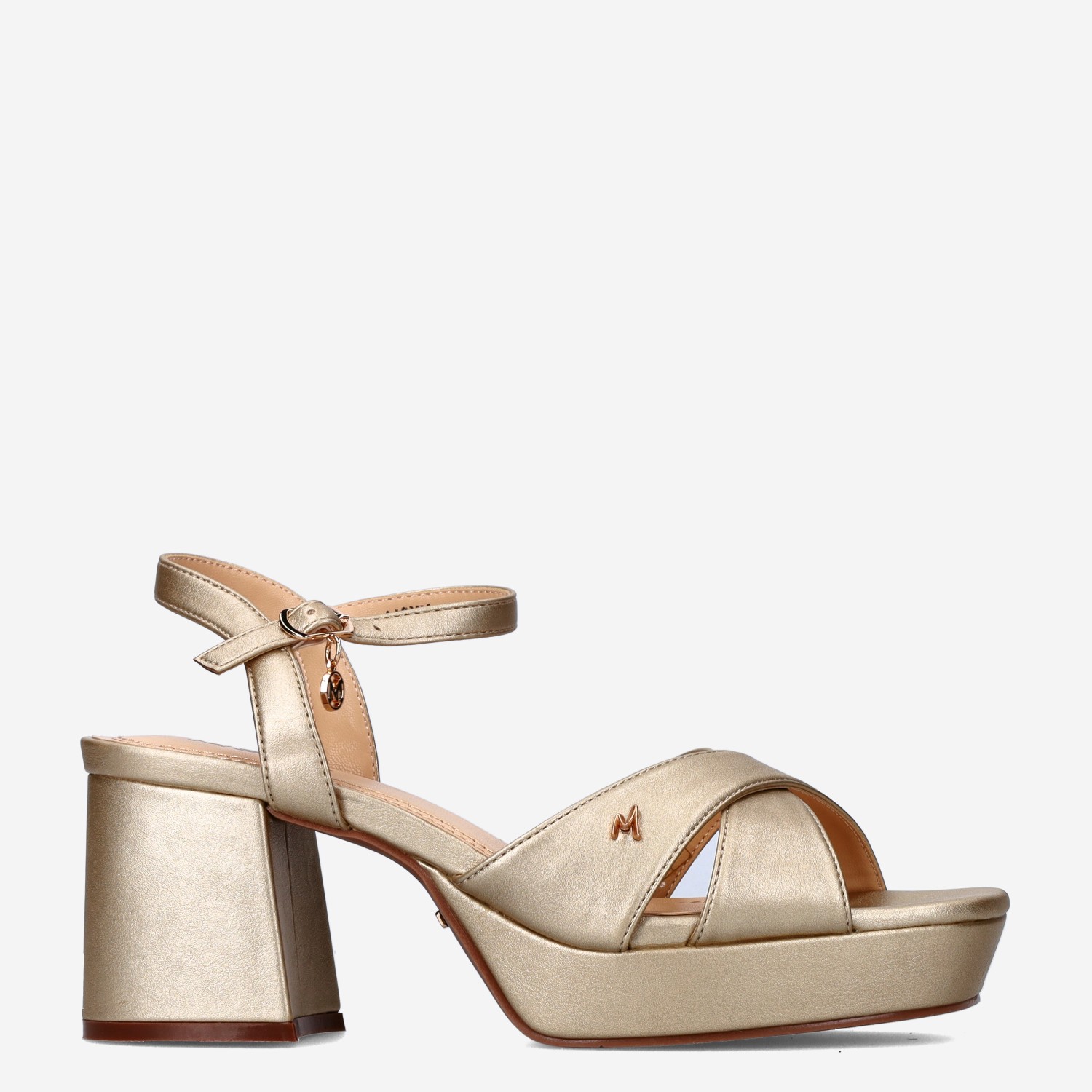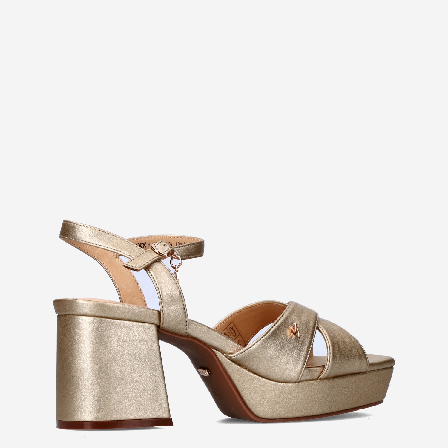 Deze gouden Nalina Nicky damessandaal is gemaakt van imitatieleer en heeft een gespsluiting. De schoen is voorzien van een stevige blokhak van ongeveer 8 centimeter. Combineer deze opvallende sandaal met een jurk of pantalon.