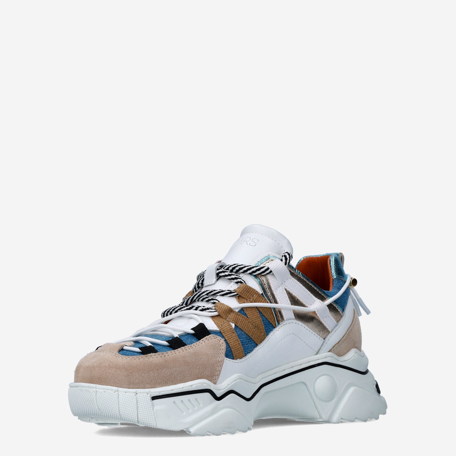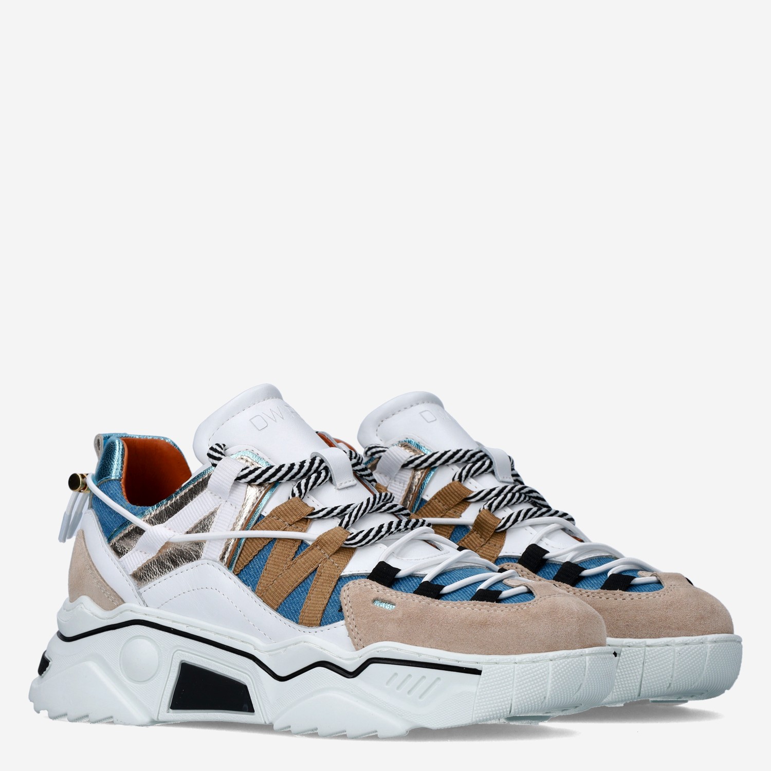 Deze wit met blauwe Orion damessneaker van DWRS is gemaakt van leer en heeft verschillende toffe overlays van denim en metallic accenten. De chunky witte zool geeft de schoen een sportieve uitstraling! Combineer deze sneaker met een jeans.