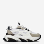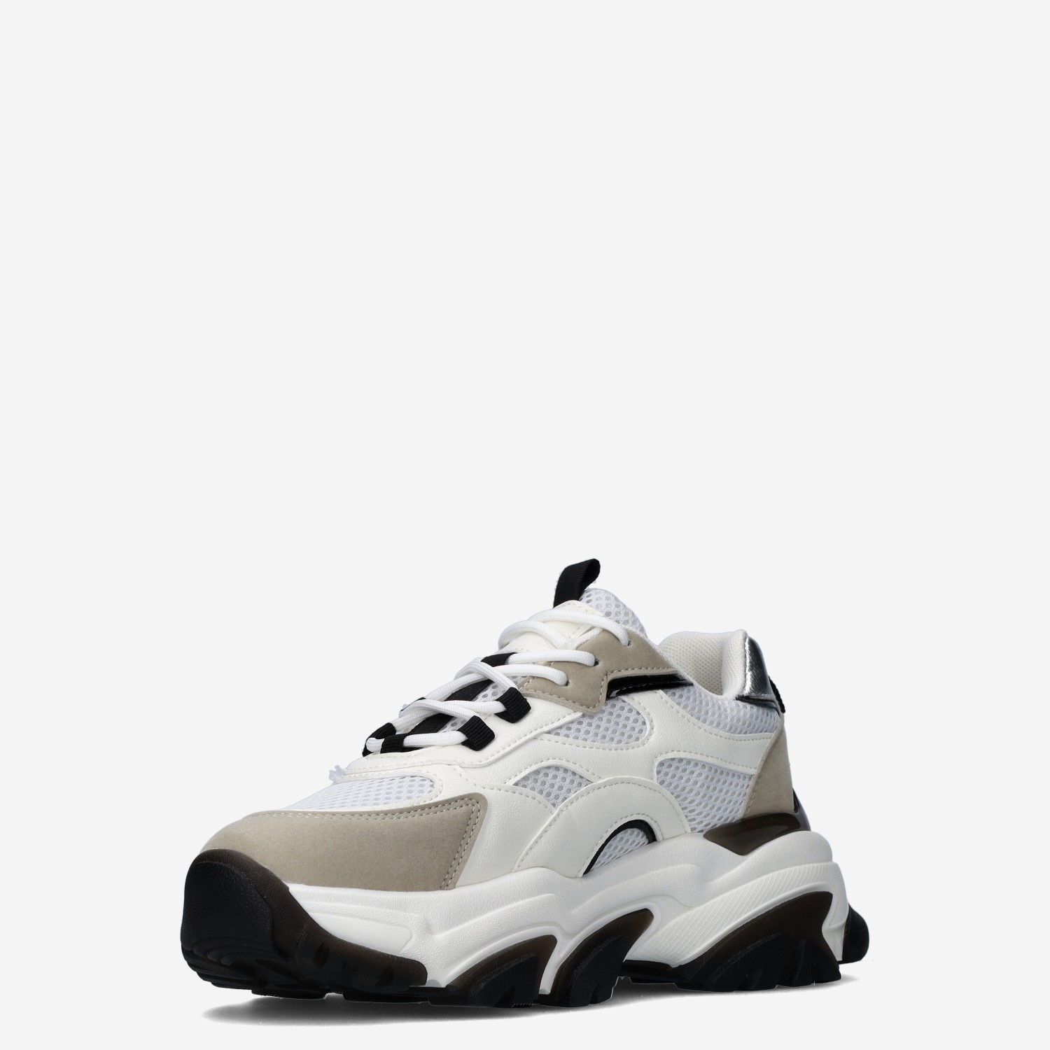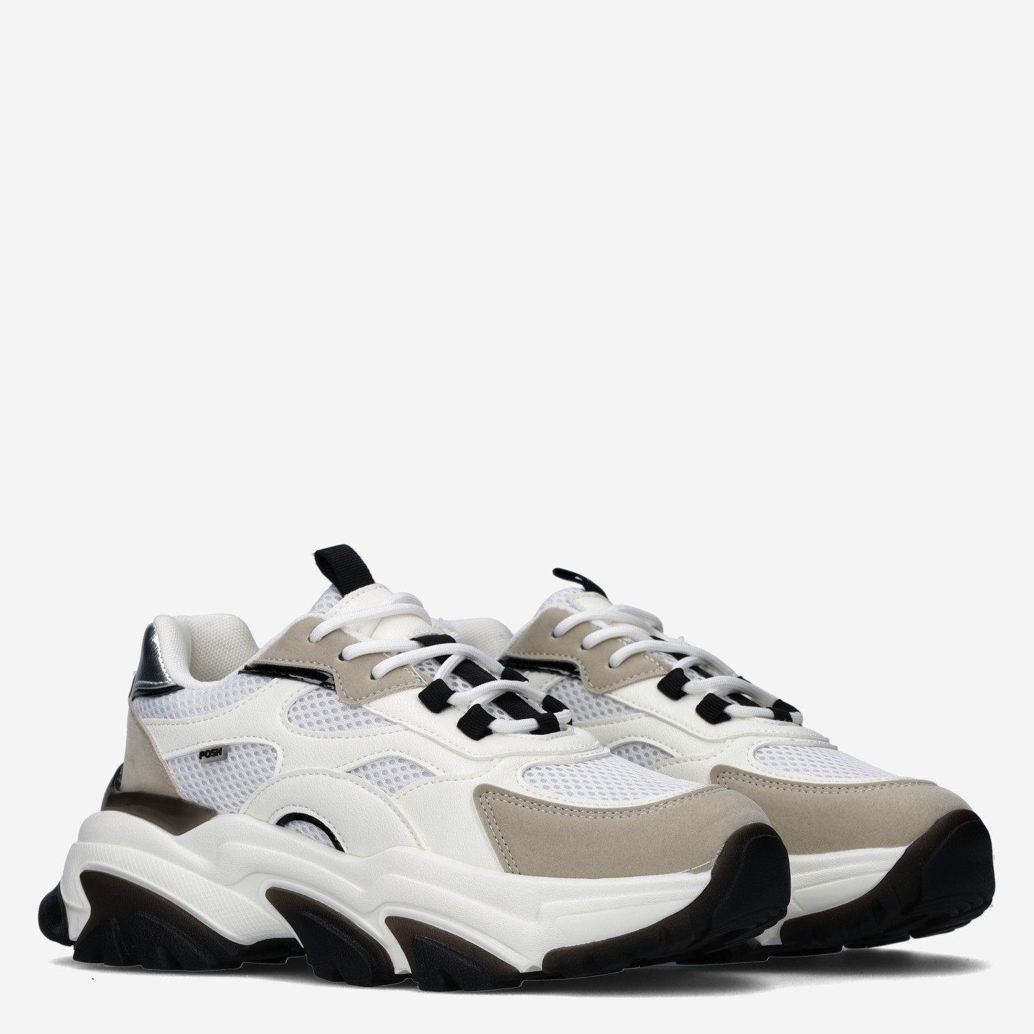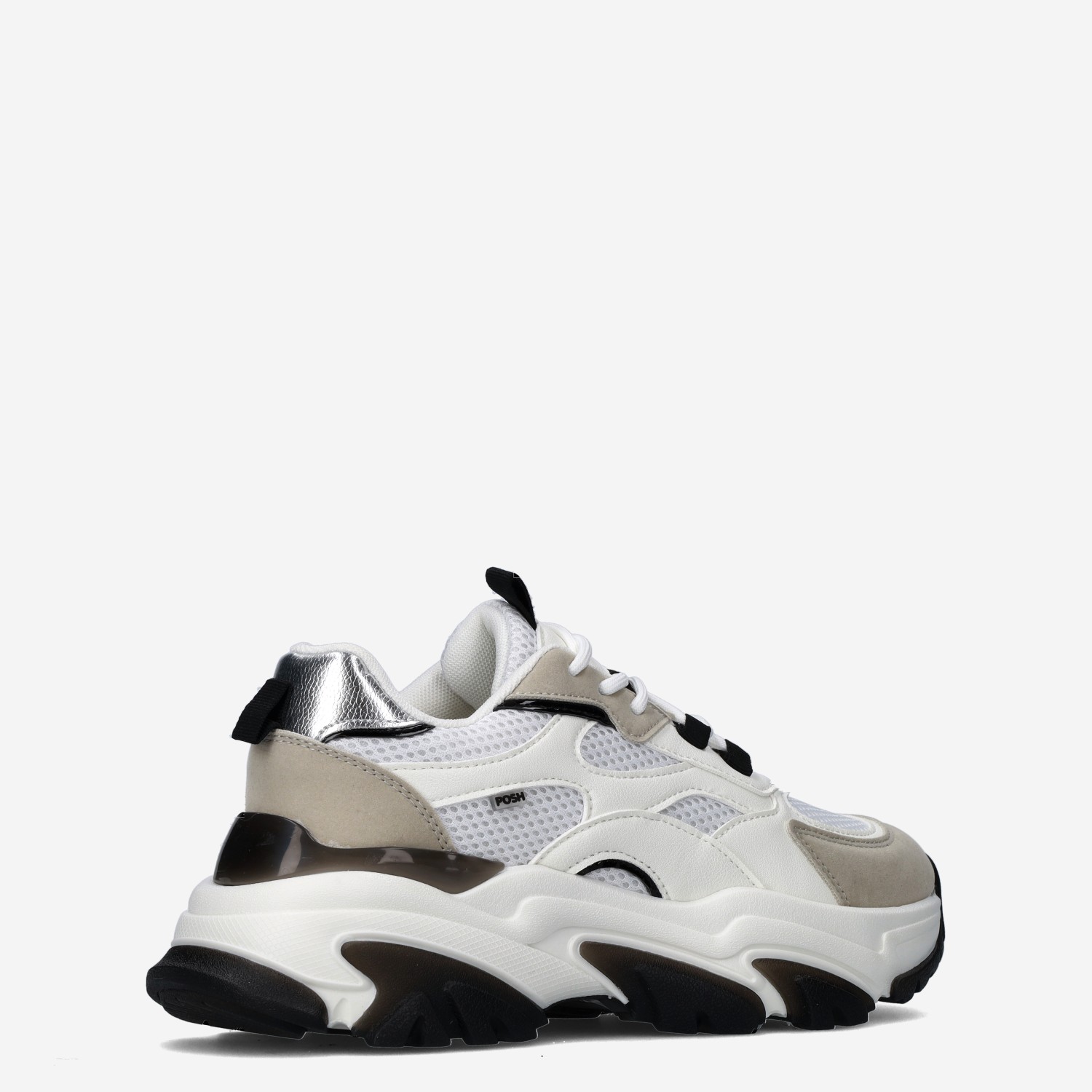 Deze wit met grijze Polly damessneaker van Posh is gemaakt van imitatieleer in combinatie met textiel. De sneaker is voorzien van verschillende overlays, mesh en metallic accenten. De chunky loopzool geven de sneaker een sportieve look.