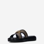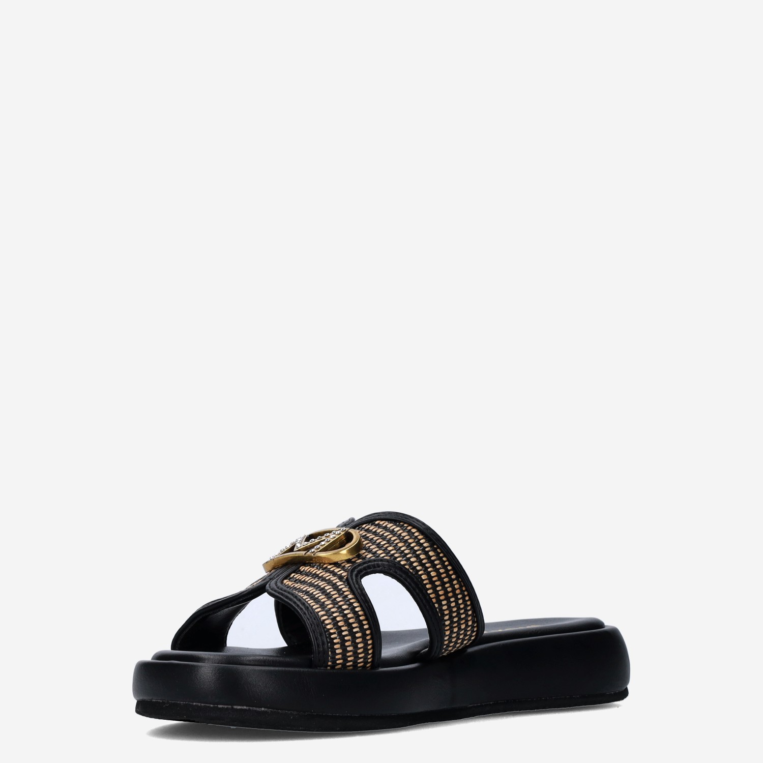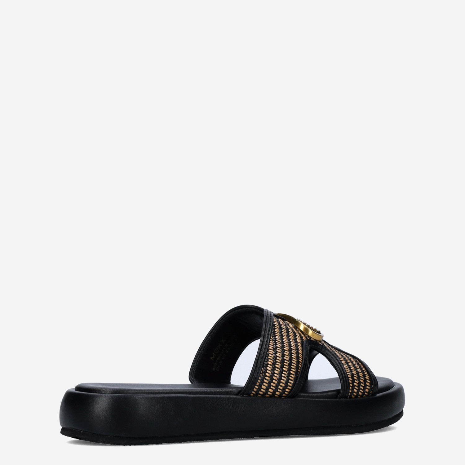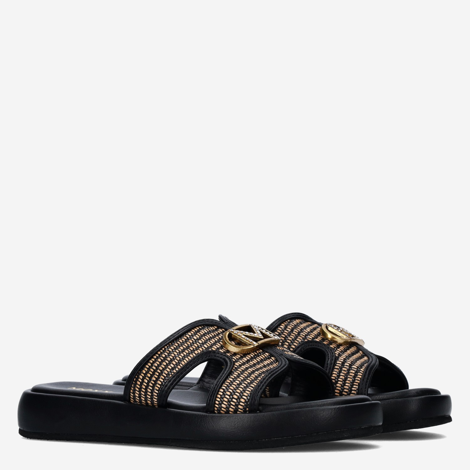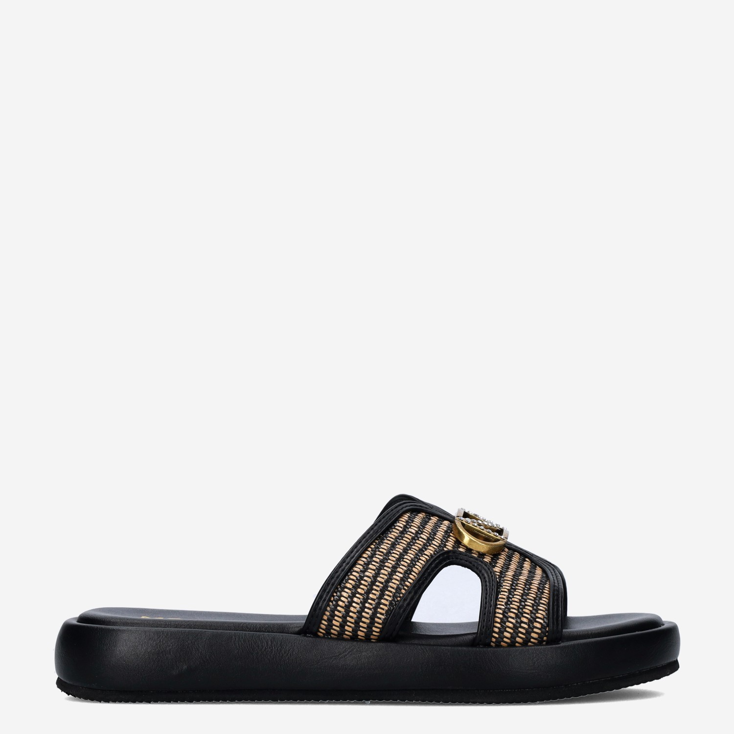 Deze zwart met bruine Rami Pacha damesslipper van Mexx is gemaakt van imitatieleer en heeft een gouden decoratie gesp met strassteentjes. Combineer deze slipper onder een jurk of rok!