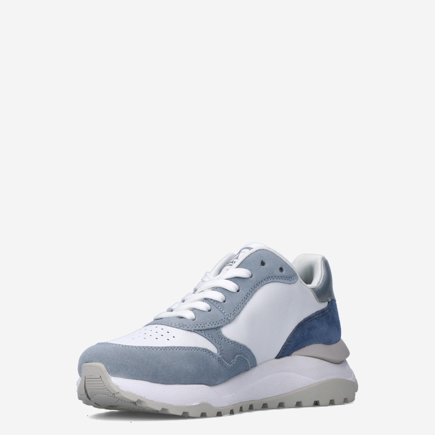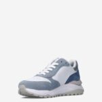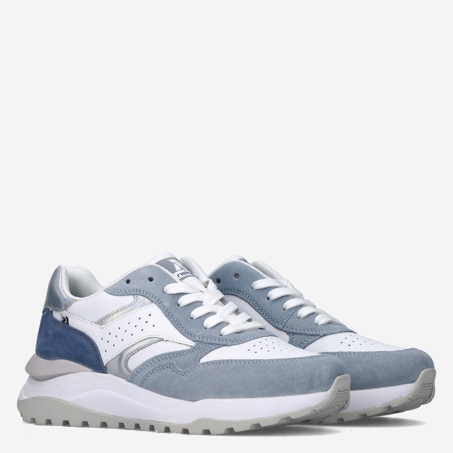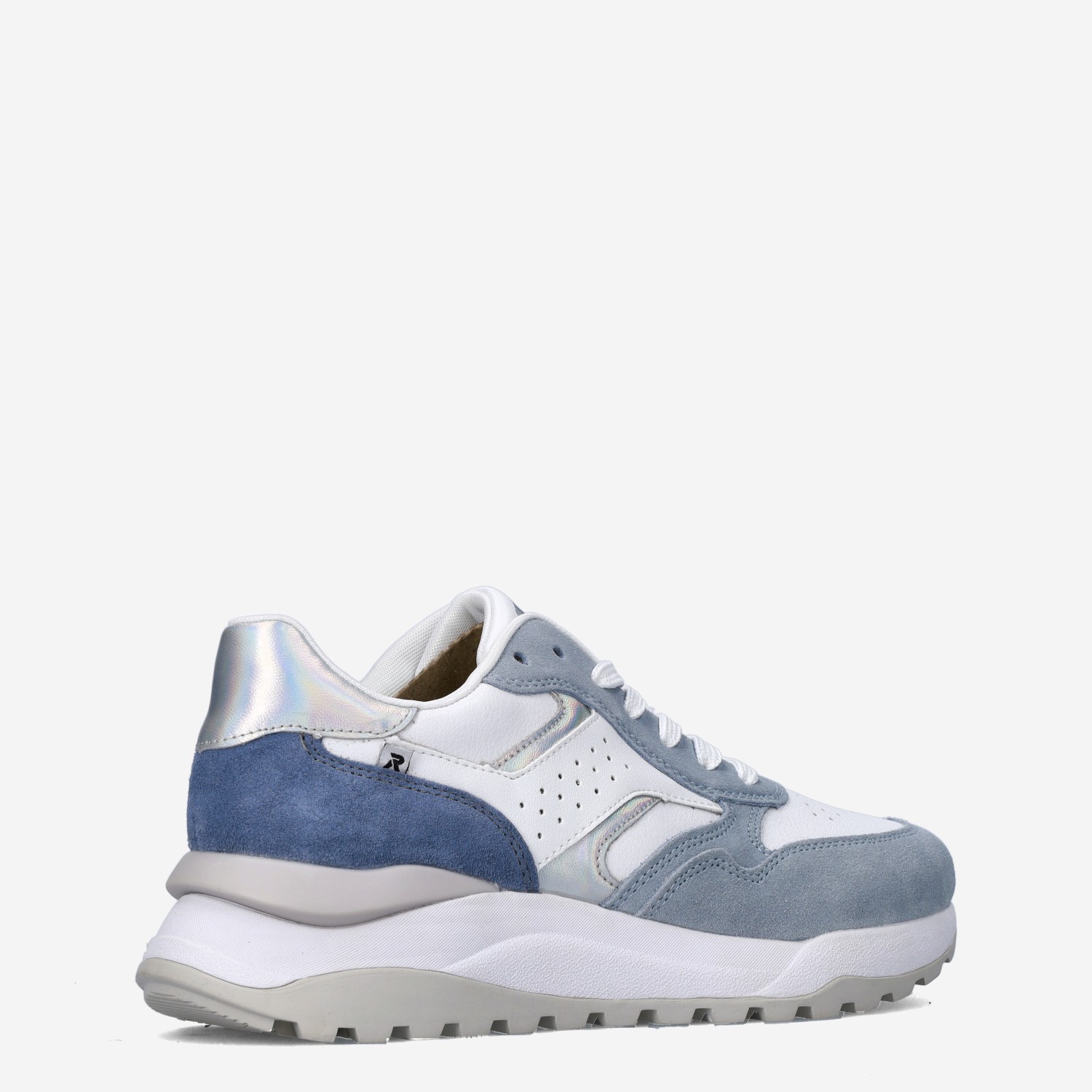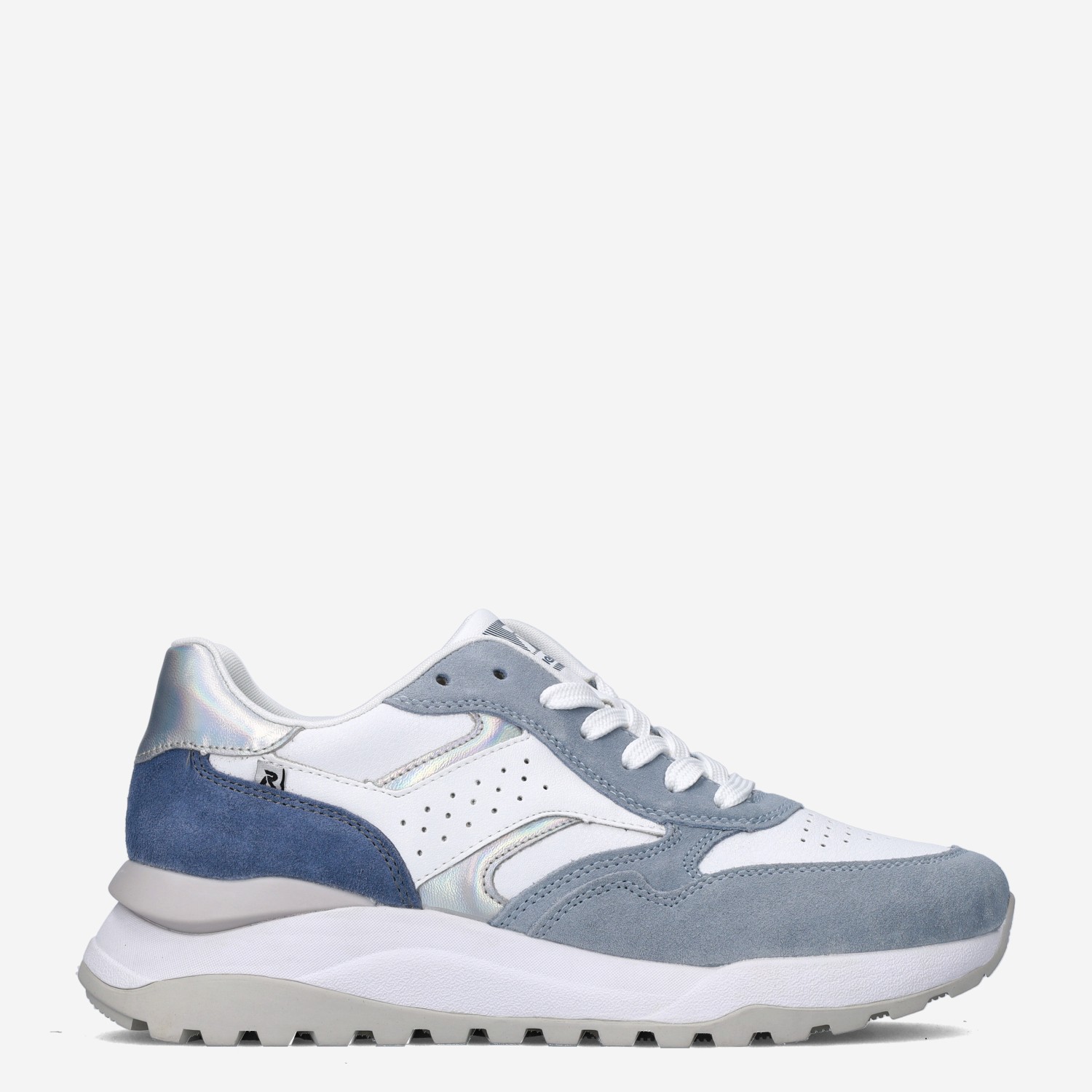 Deze blauw met witte Samira damessneaker van Rieker is gemaakt van verschillende leersoorten in combinatie met textiel. Deze sportieve sneaker is voorzien van metallic zilveren accenten en kun je goed combineren onder een jeans!