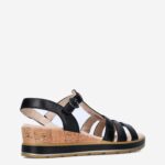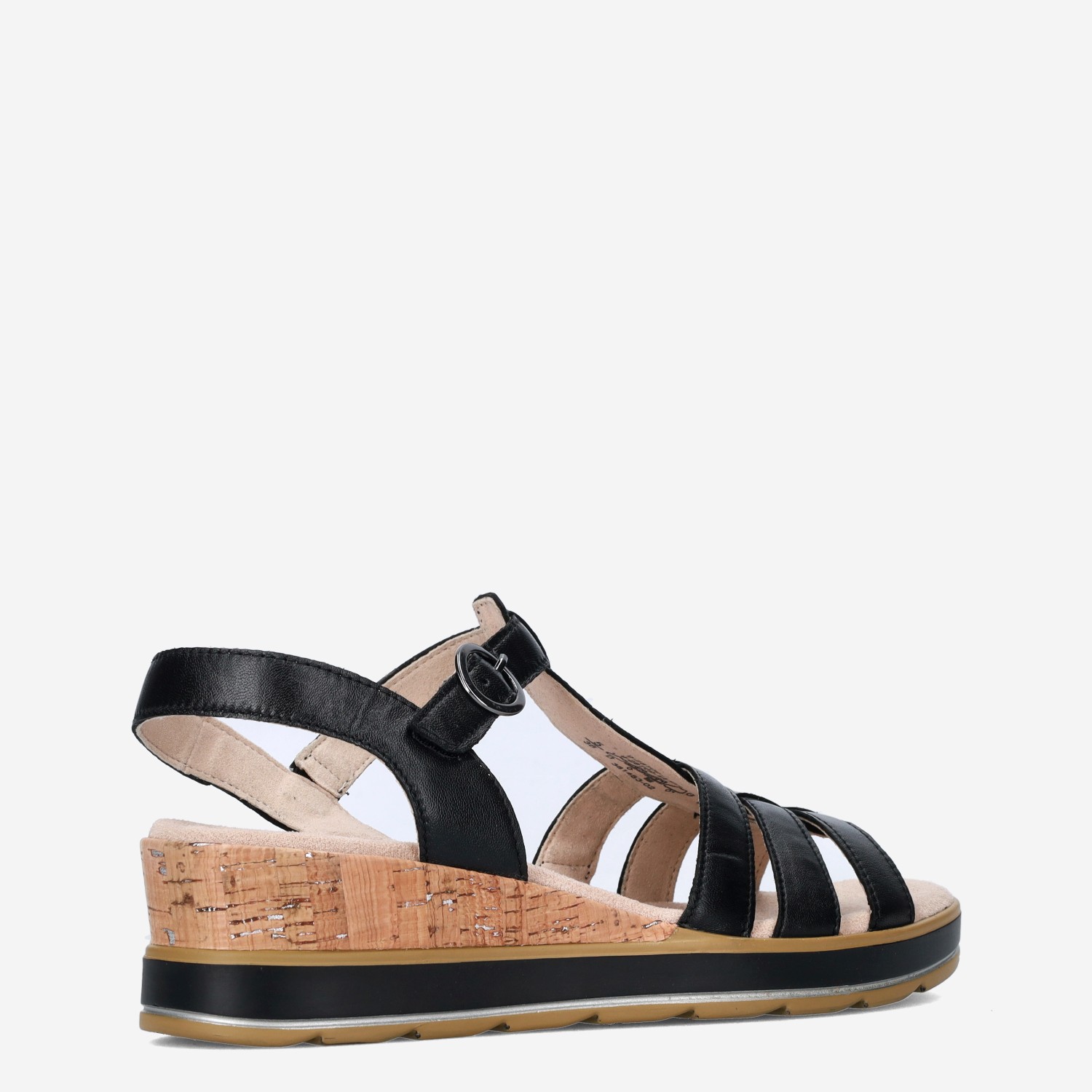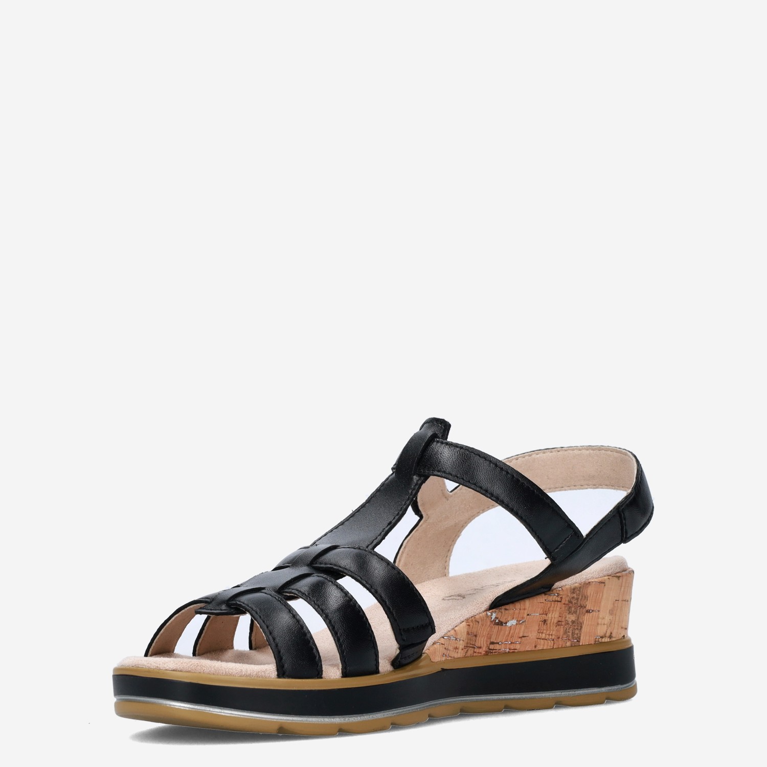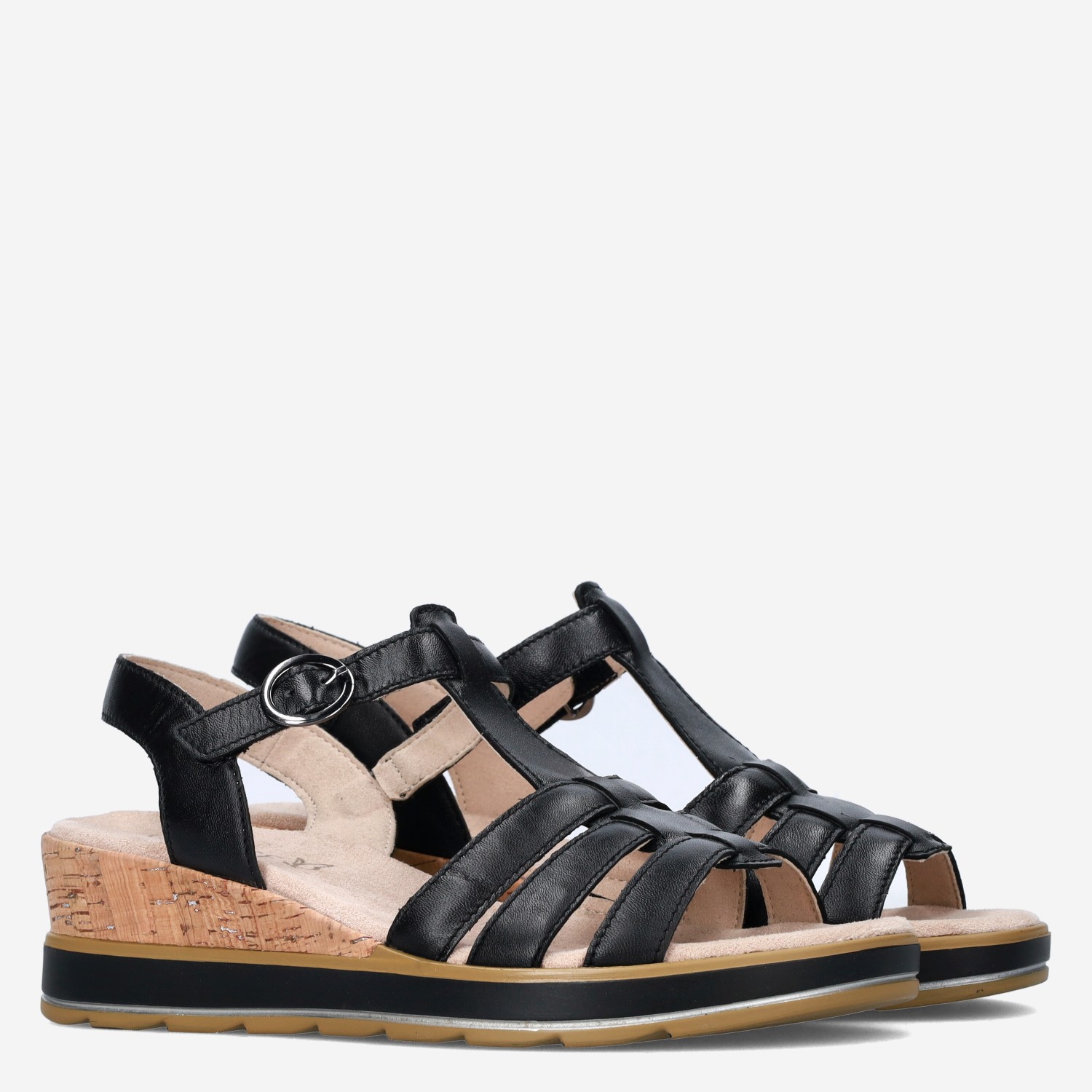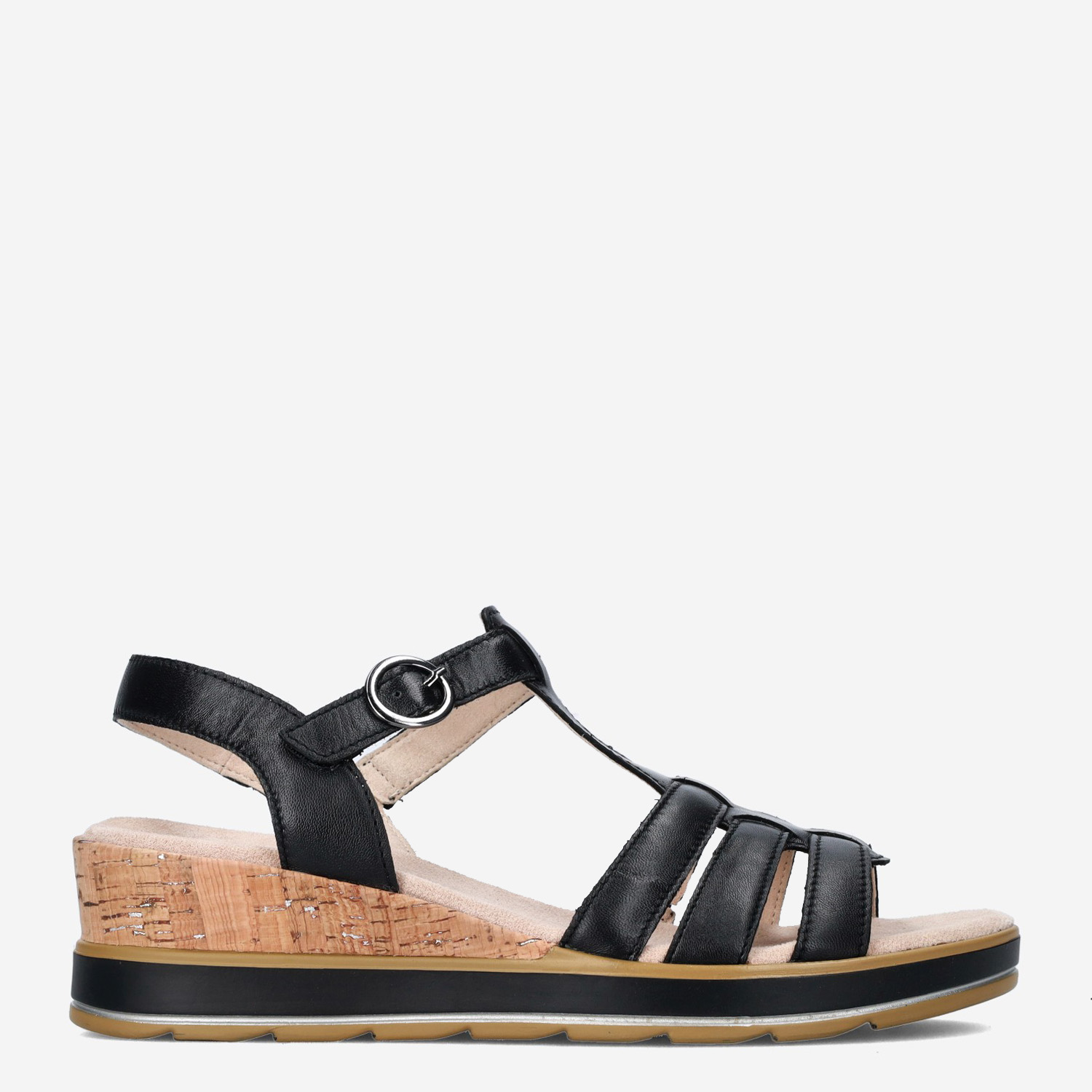 Deze zwarte damessandaal van Caprice is gemaakt van leer.