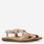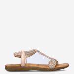 Deze roségouden Bridge damessandaal is gemaakt van imitatieleer in combinatie met een elastieken band. De sandaal heeft een gevlochten design en door de elastieken band kun je gemakkelijk in en uit deze sandaal stappen. Combineer de sandaal met een korte broek!