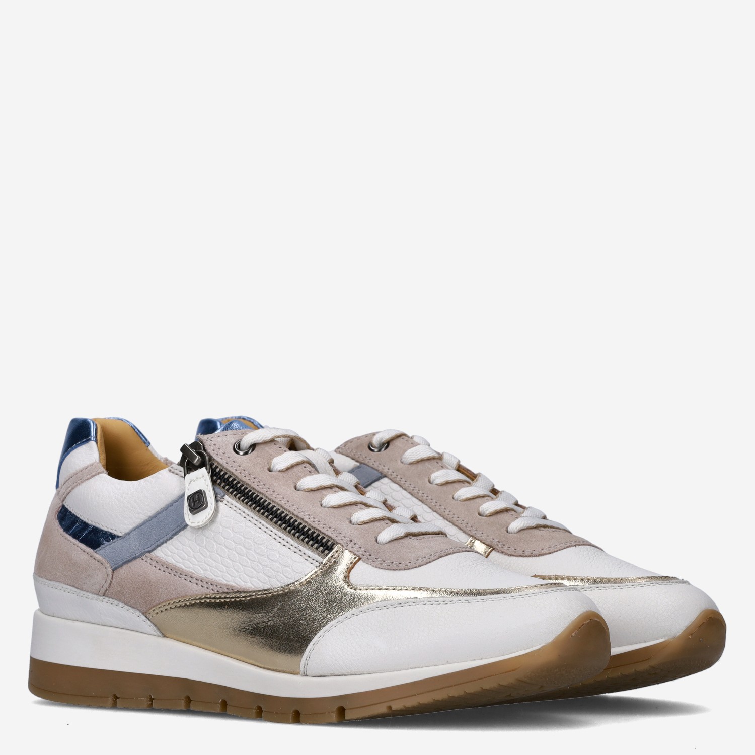 Deze witte multicoloured Sneaker H damesschoen van Helioform is gemaakt van verschillende leersoorten. De sneaker is voorzien van zowel een rits- als vetersluiting voor een gemakkelijke instap. Combineer deze schoen met metallic accenten met een jeans!
