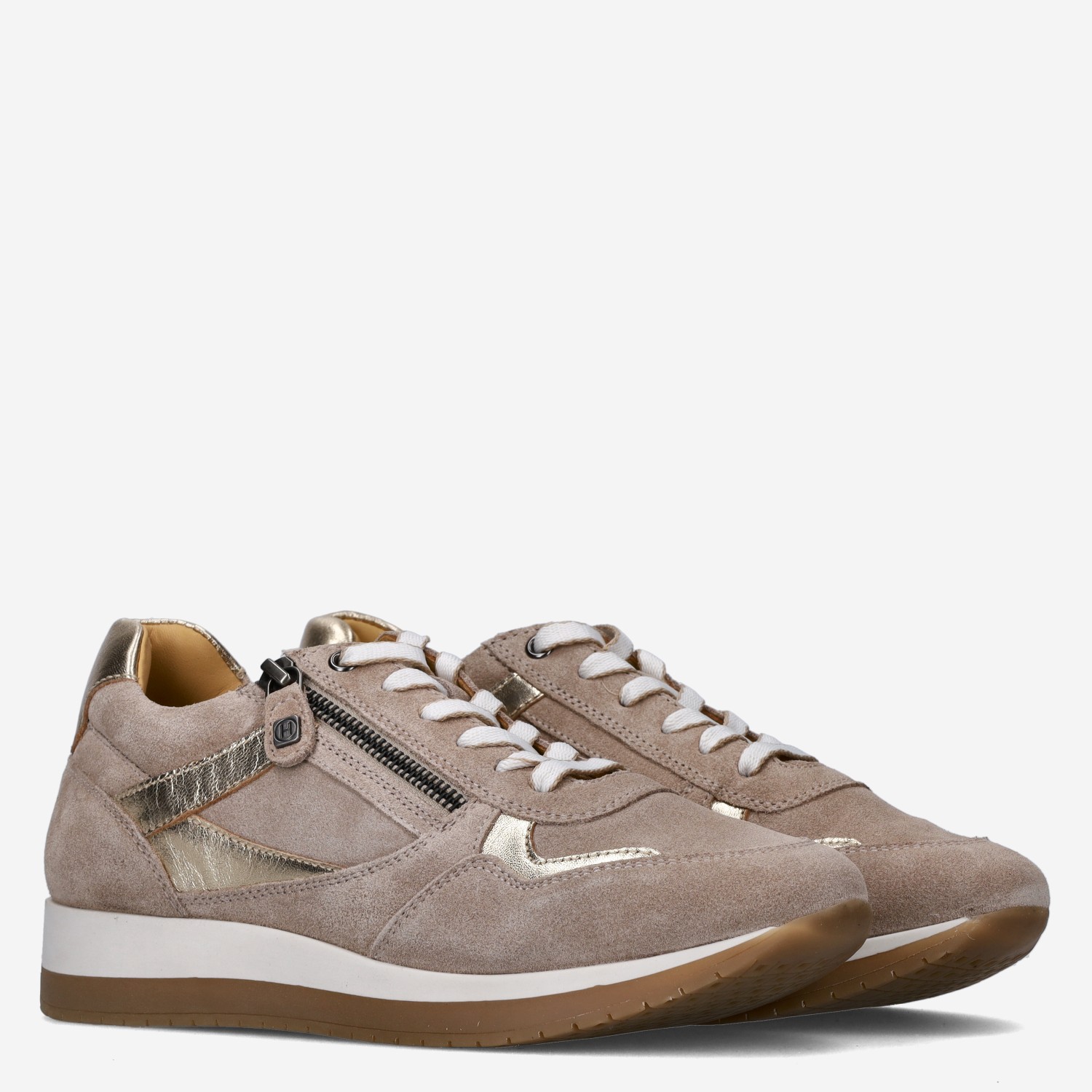 Deze beige Sneaker H damesschoen van Helioform is gemaakt van verschillende leersoorten. De sneaker is voorzien van zowel een rits- als vetersluiting voor een gemakkelijke instap. Combineer deze sneaker met gouden accenten met een pantalon.