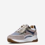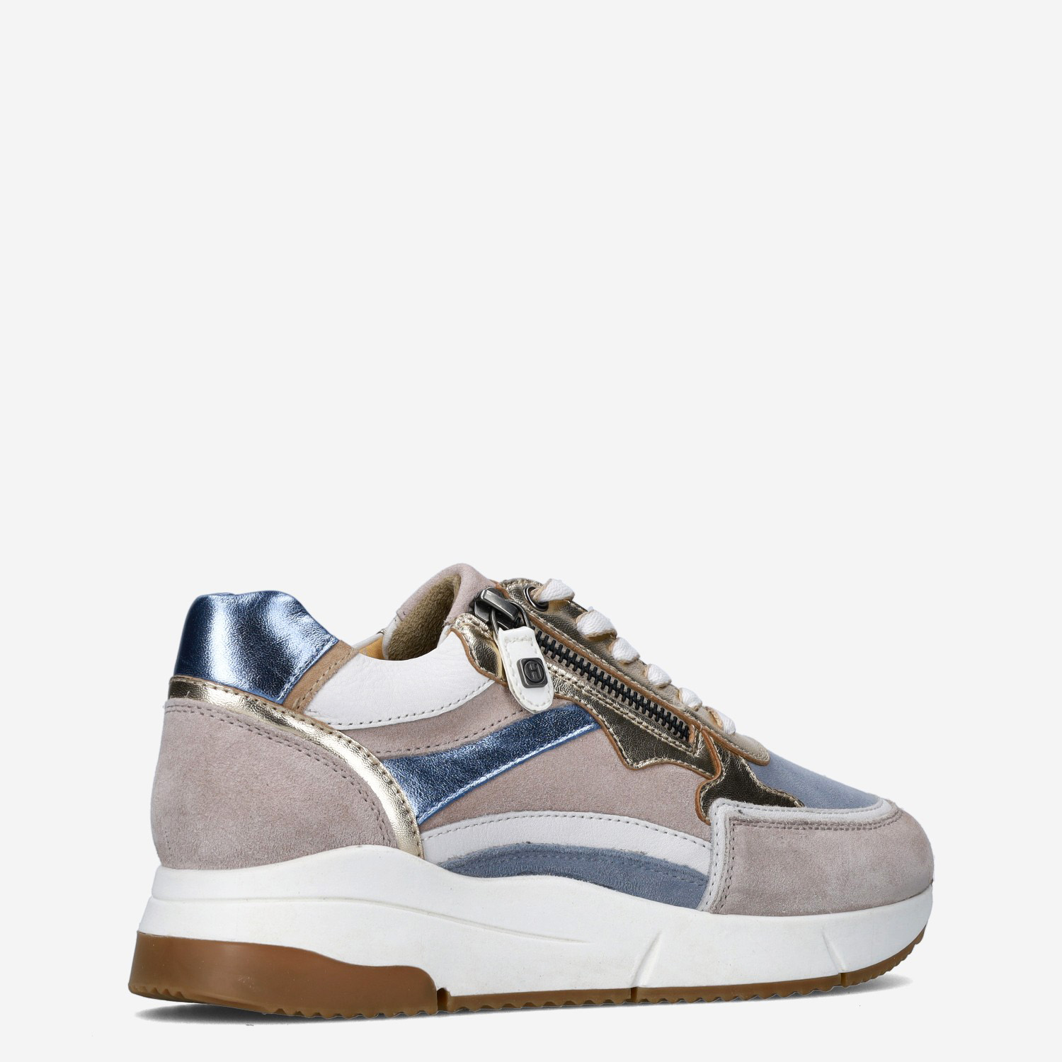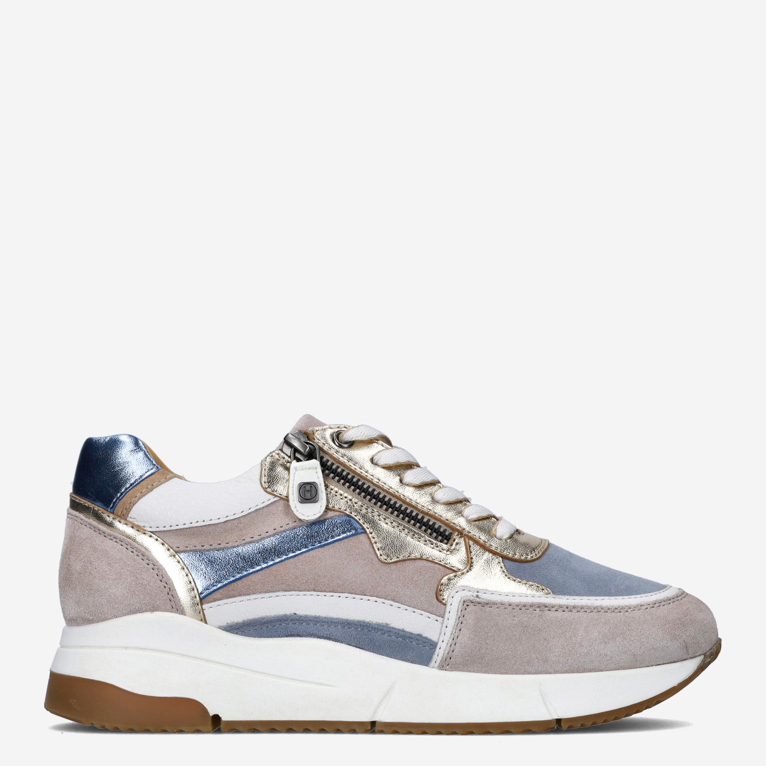 Deze beige met blauw, gouden Sneaker H damesschoen van Helioform is gemaakt van verschillende leersoorten. De sneaker is voorzien van zowel een rits- als vetersluiting voor een gemakkelijke instap. Combineer deze metallic sneaker met een jeans!