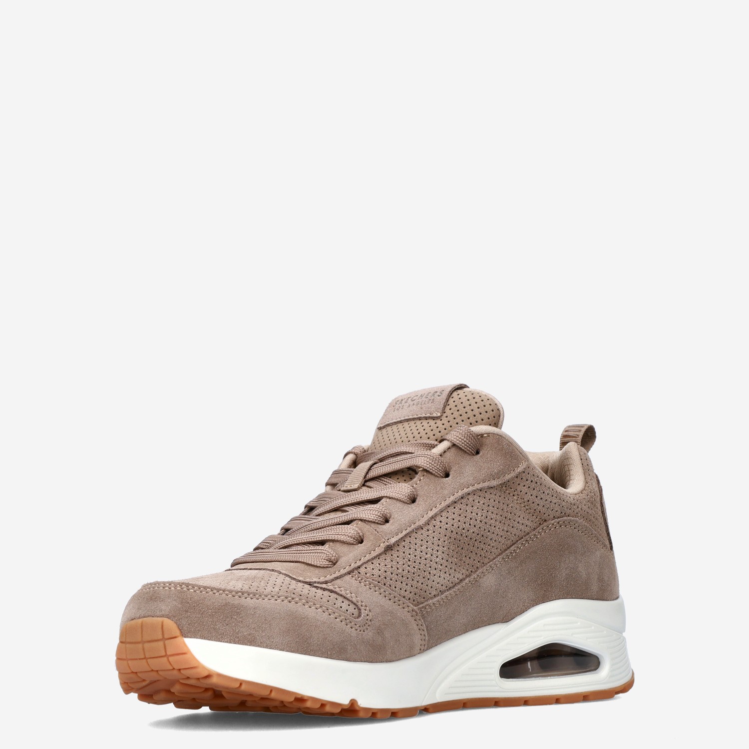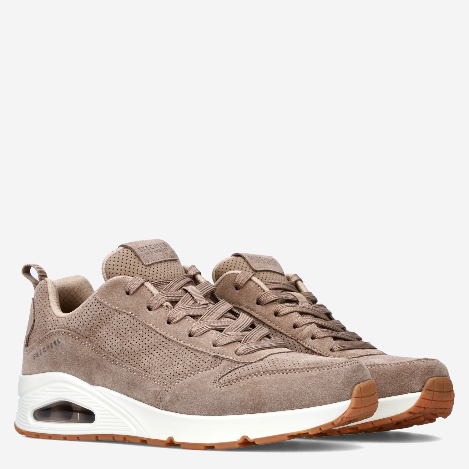 Deze bruine Skechers Uno herensneaker is gemaakt van suède in combinatie met geperforeerd suède en heeft een flexibele rubberen buitenzool. De sneaker is voorzien van een comfortabele binnenzool met Skechers Air Cooled Memory Foam® en heeft een zichtbare Skech-Air®-tussenzool met luchtdemping. Combineer deze sneaker onder een mooie pantalon!