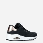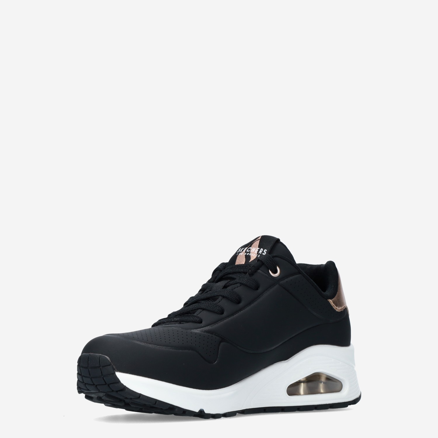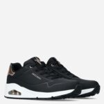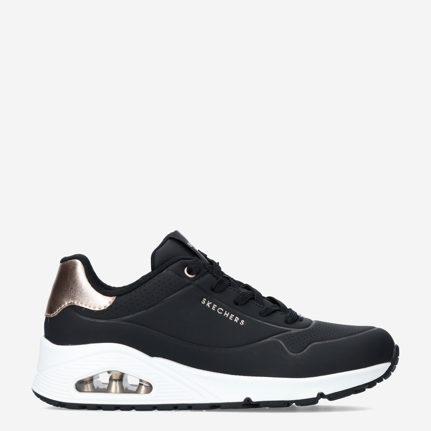 Deze zwarte Skechers Uno Golden Air damessneaker is gemaakt van synthetische ‘durabuck’ en heeft een flexibele rubberen buitenzool. De sneaker is voorzien van een comfortabele binnenzool met Skechers Air Cooled Memory Foam® en heeft een zichtbare Skech-Air®-tussenzool met luchtdemping. Combineer deze sneaker met gouden accent onder elke jouw favoriete outfit.