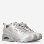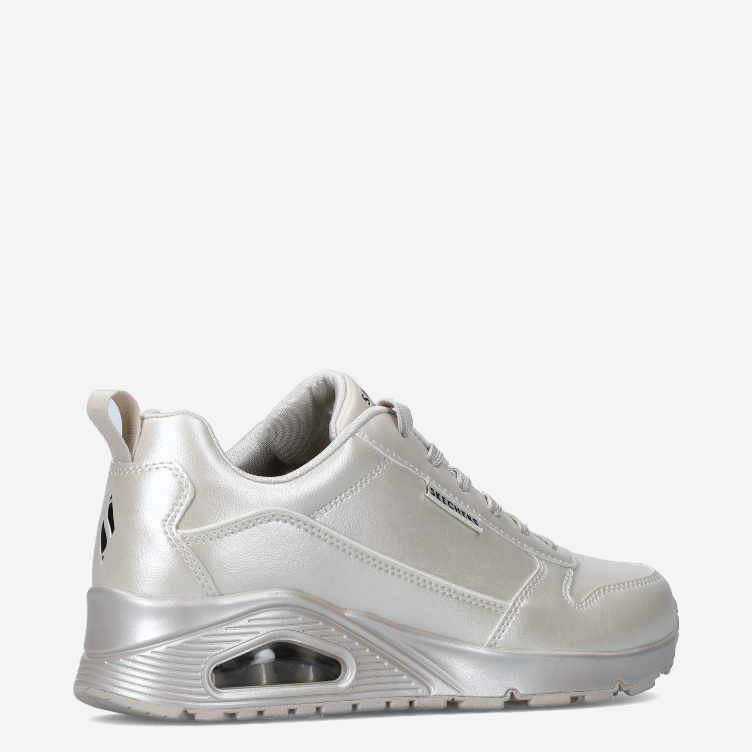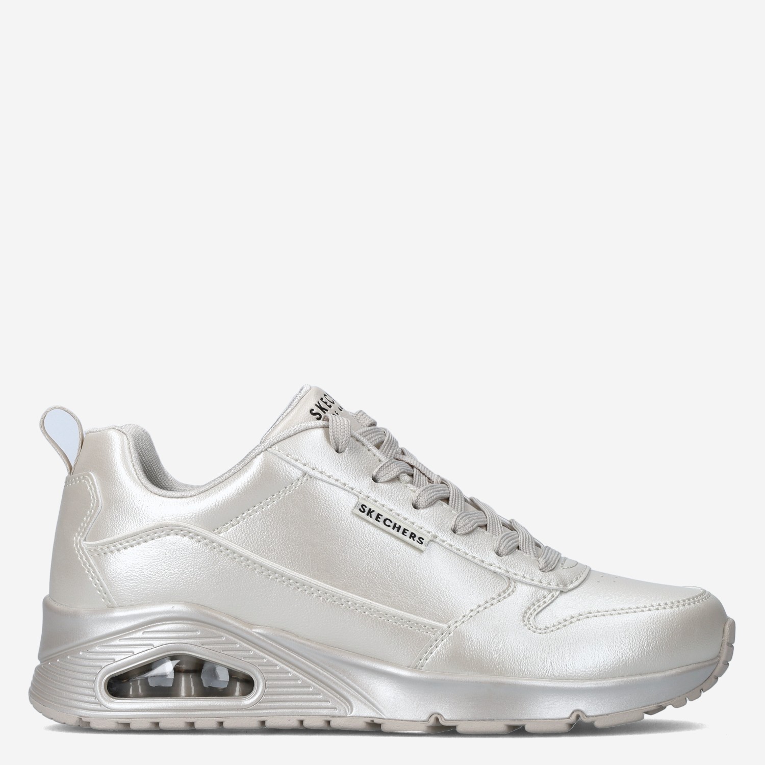 Deze offwhite metallic Skechers Uno Street Shine damessneaker is gemaakt van imitatieleer in combinatie met textiel. De sneaker is voorzien van een vetersluiting en heeft een verhoogde loopzool met luchtkussen en biedt extra comfort. Combineer deze sneaker met een jeans of met een pantalon.