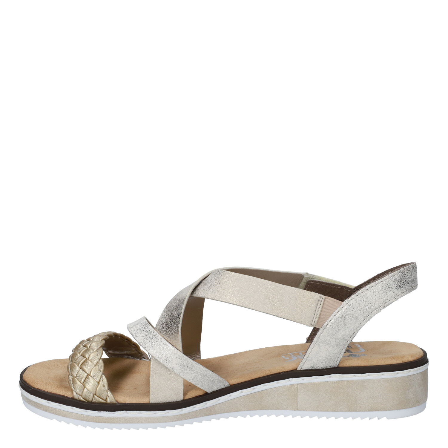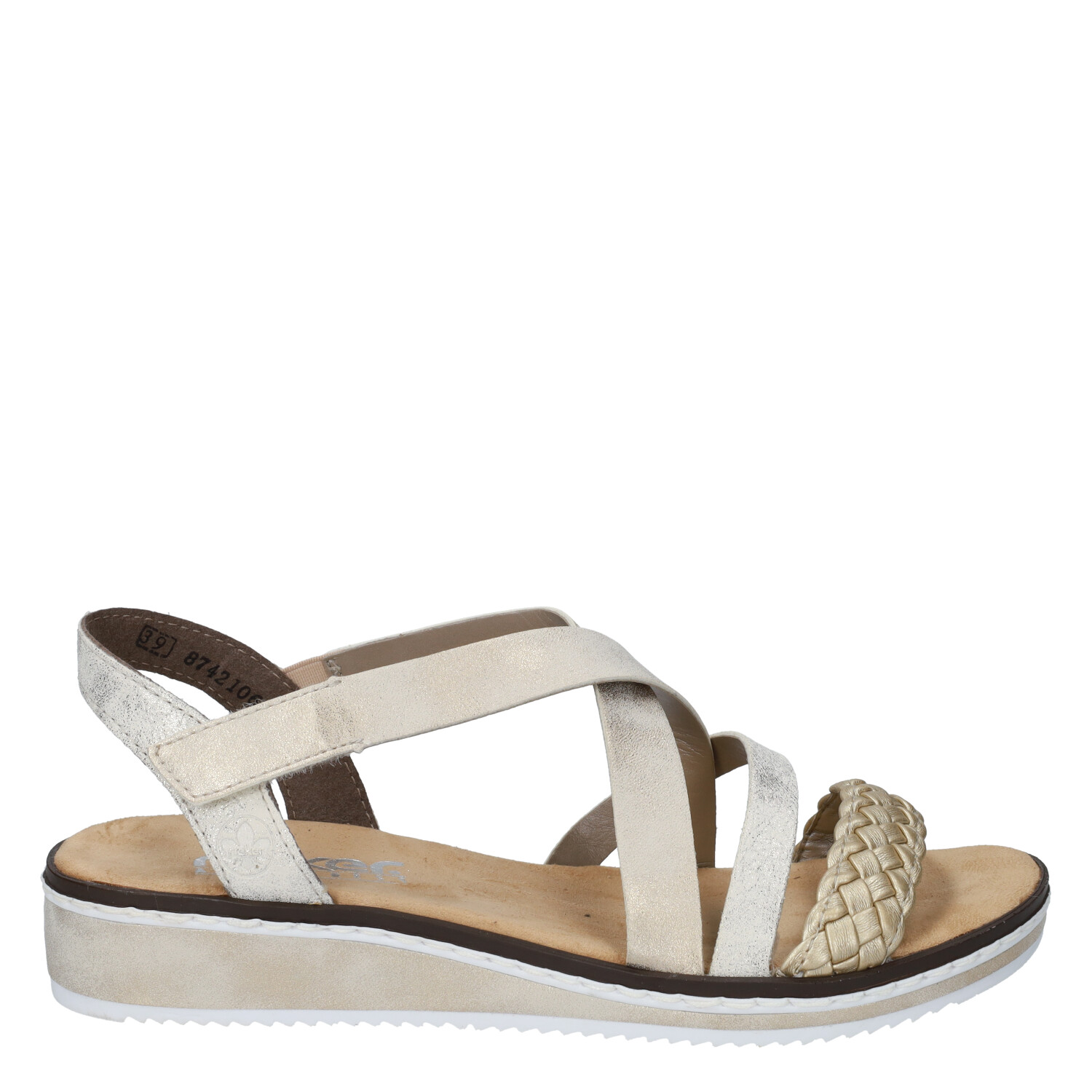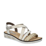 Deze gouden Rieker Woven damessandaal komt uit de nieuwe collectie van Rieker. De sandaal is gemaakt van textiel, in combinatie met synthetisch materiaal. Het voetbed is vast en de sandaal kent een klittenbandsluiting. Combineer deze sandaal met een lange rok of jeans.